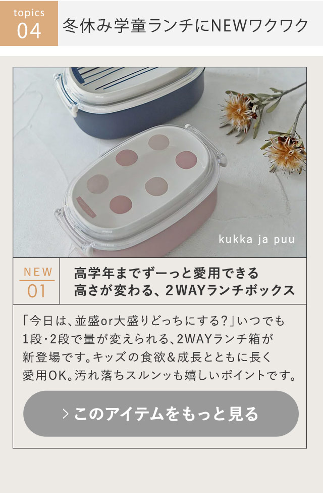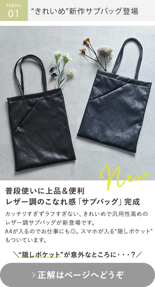 〔1〕 フェイクレザーの新作「きれいめサブバッグ」 〔2〕 国産天然木のおもてなしトレイ初登場 〔3〕 お待たせしました!欠品リュック復活 〔4〕 冬休みの学童弁当にNEW~~~! 〔5〕 春まで着映え、ほんのり冒険トップス