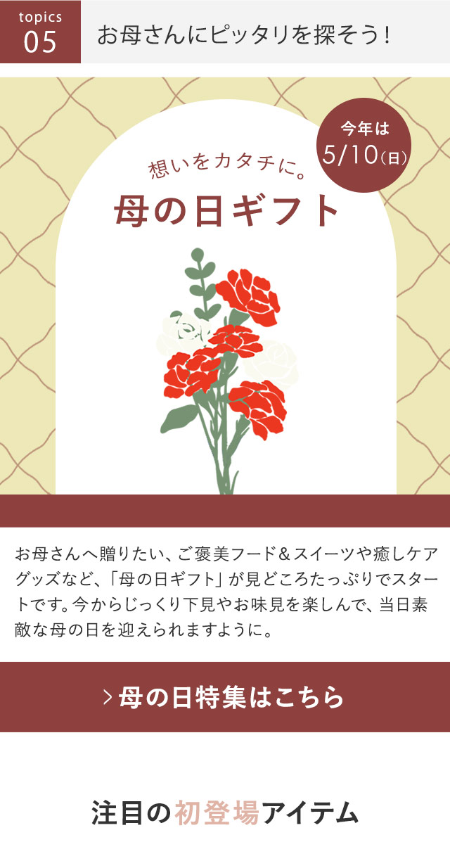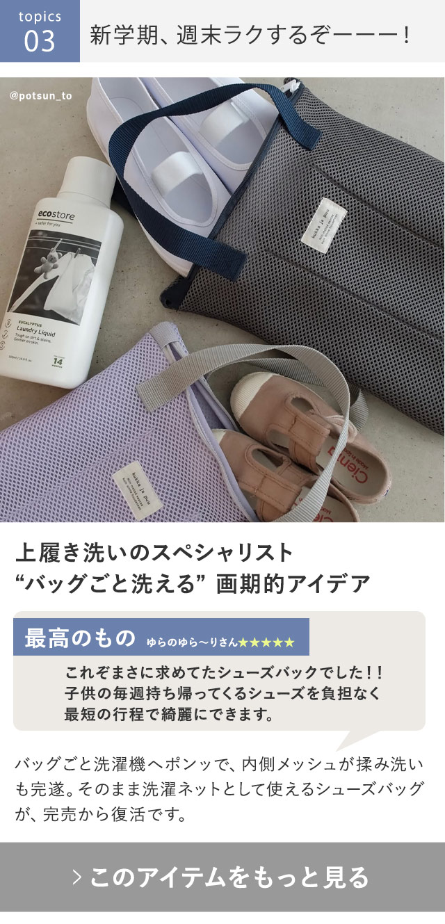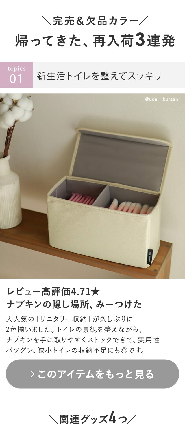 〔1〕 【再入荷1】トイレ整える、ナプキン収納 〔2〕 【再入荷2】「口当たりの良さ」に驚く、スリムスプーン 〔3〕 【再入荷3】週末の上履き洗いは、バッグごとポンッ? 〔4〕 そろそろ紫外線、日傘ラインナップ一気見 〔5〕 「母の日」特集、新アイテム続出でOPEN!