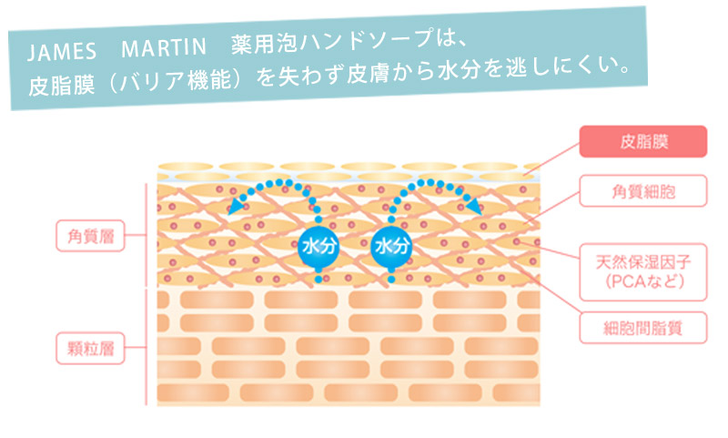JAMES MARTINのハンドソープは、1日に何度も手を洗う方々(医療・介護・飲食事業者など)や、敏感肌の方が安心して使えるように、プロピレングリゴールとPCA-Naという保湿成分を添加しており、手肌にうるおいを残します。