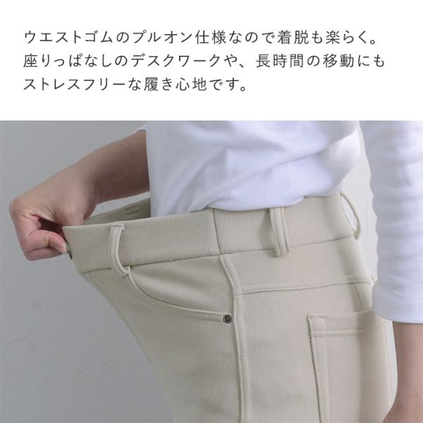 ウエストゴムのプルオン仕様なので着脱も楽らく。座りっぱなしのデスクワークや、長時間の移動にもストレスフリーな履き心地です。