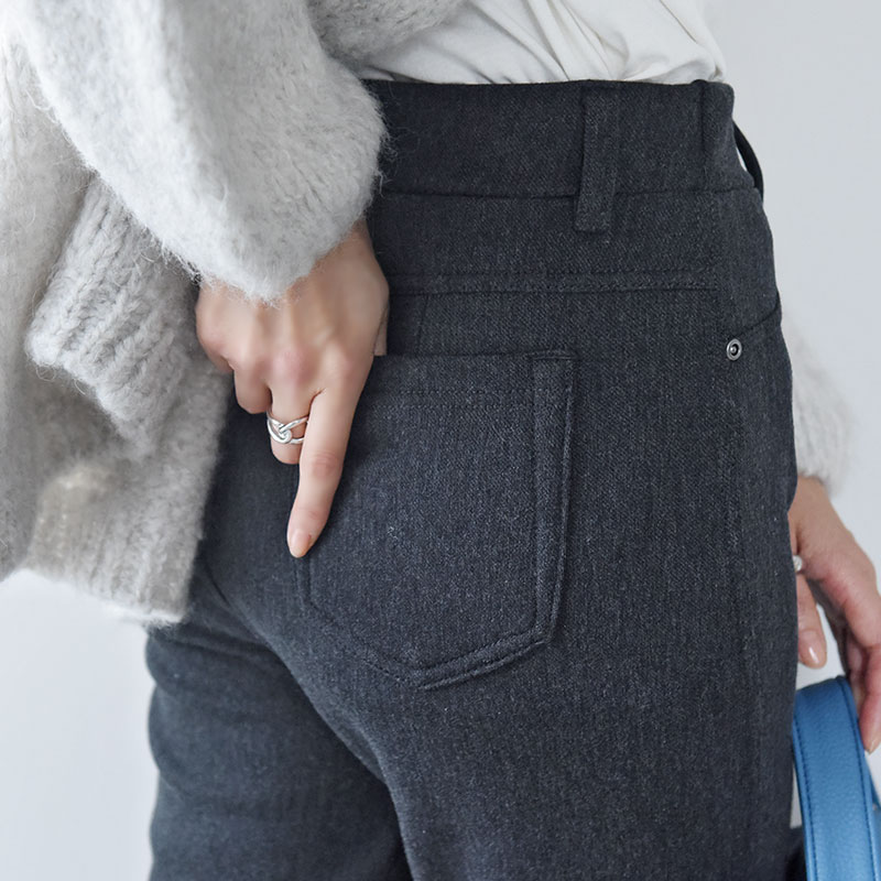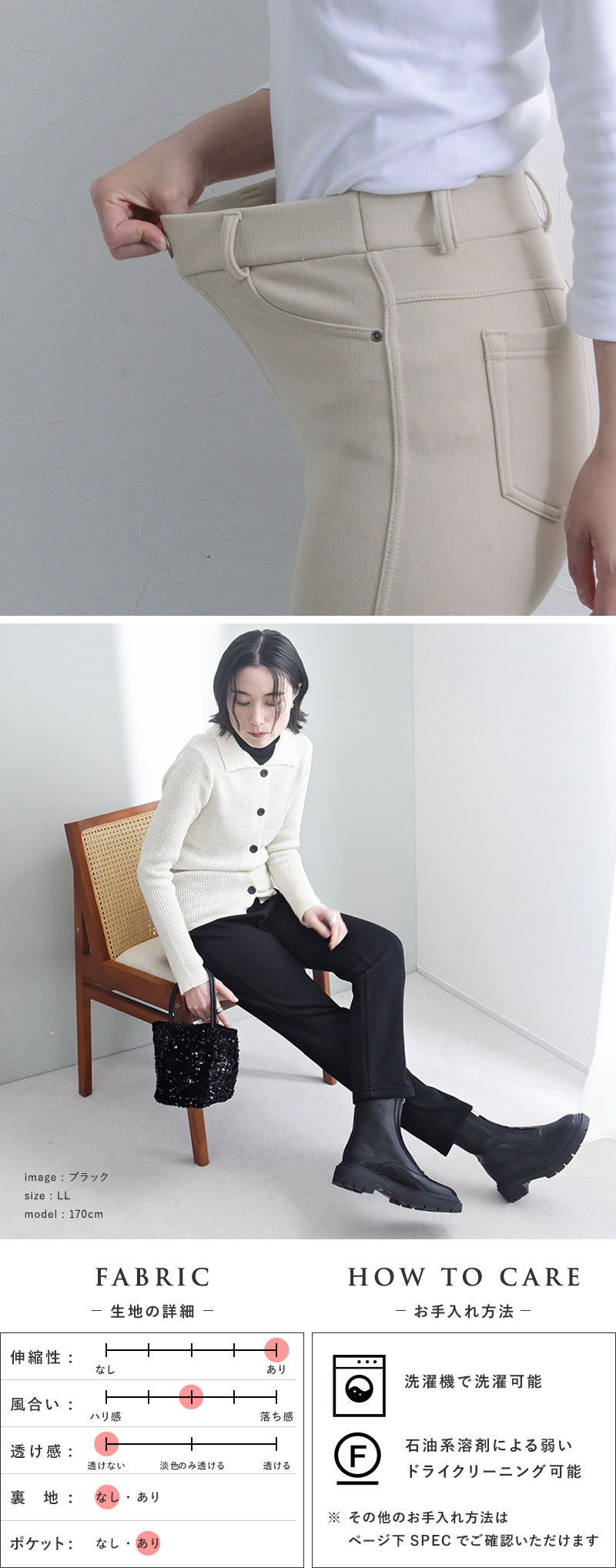 股上がしっかりあるのでしゃがんでも安心。ヒップに沿うデザインなので穿いたときに腰回りをすっきり見せてくれます。