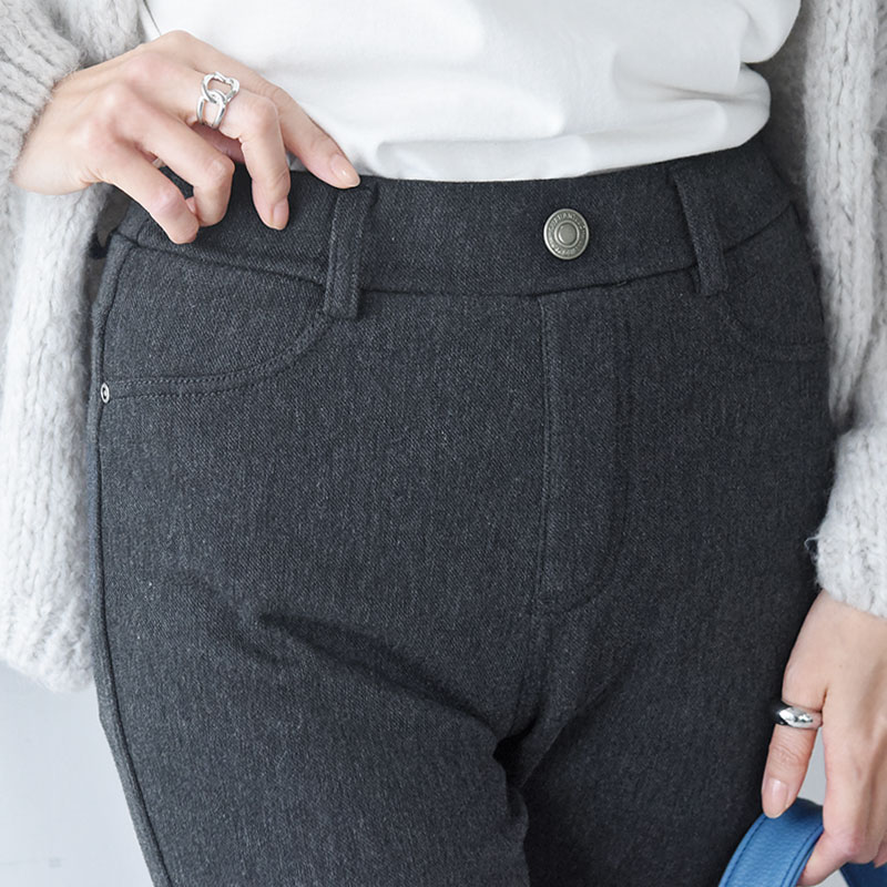 裏面全体が厚みのあるベロア素材で覆われた、真冬に大活躍のあったかパンツ。まるで毛布に包まれているかのような暖かさで、下にタイツを重ねる煩わしさともおさらば。足を通した瞬間から、ぬくぬくとした穿き心地です。