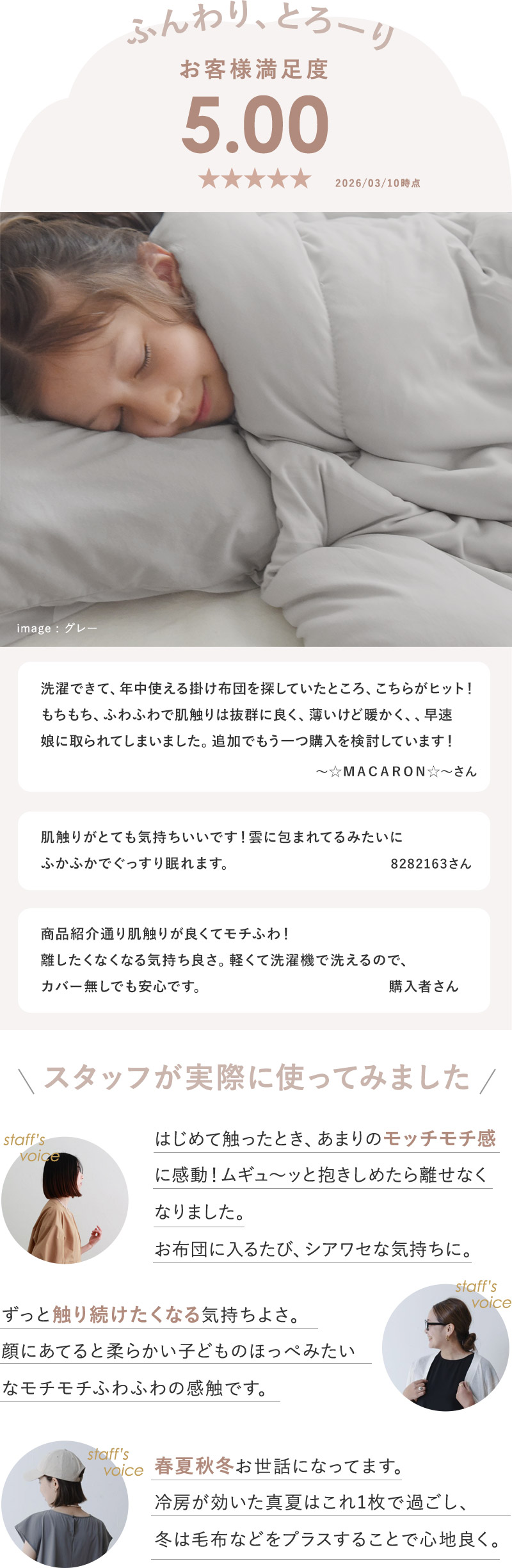 掛けているのを忘れるくらい軽やかで、お子様の寝具としてご使用いただくにも◎。お洗濯もしやすく、収納時かさばらないのが嬉しいポイントです。