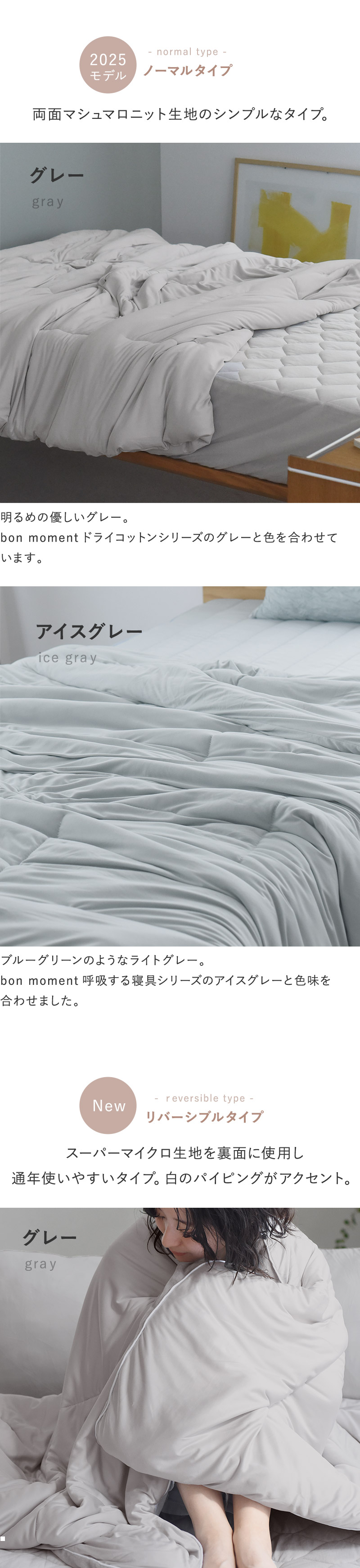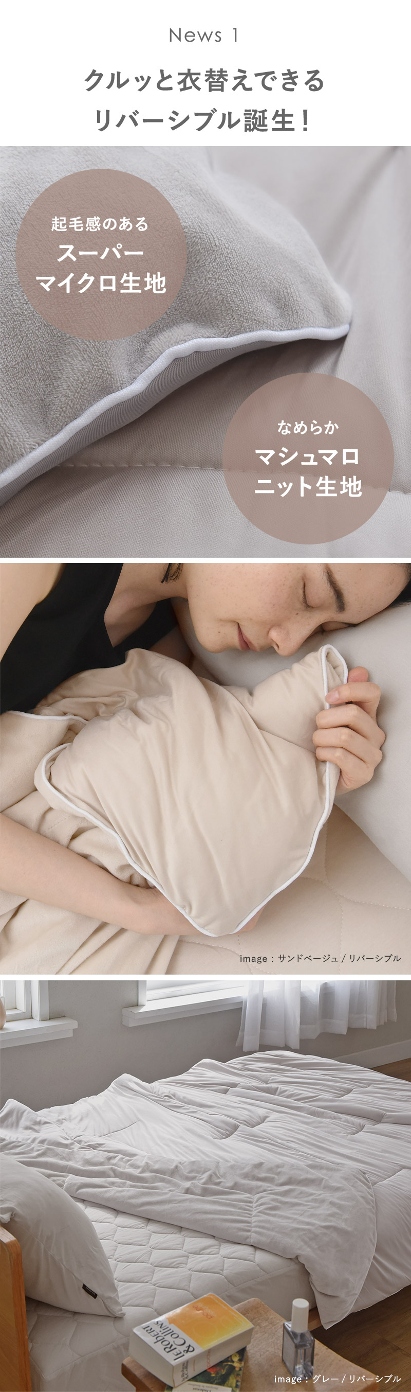 春夏の汗ばむ季節は、マシュマロニット生地を肌側に、肌寒くなってきたらスーパーマイクロ生地にくるっとチェンジ。ふんわり優しい肌触りで快適な眠りをサポートします。