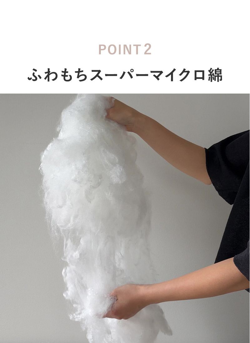中綿には、エンドレスファイバー(超長繊維)を使用したスーパーマイクロ綿を採用。繊維を約3倍の長さにすることで、よりもっちり感のある肌触りに。まるで雲の中にいるかのような、ふわふわ感が朝まで続きます。