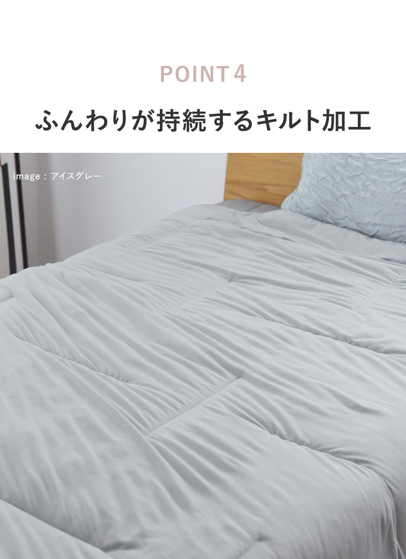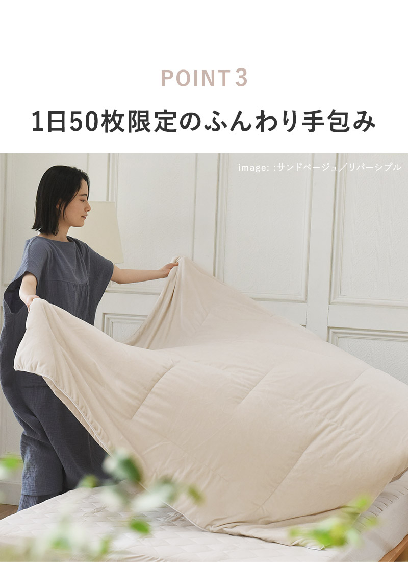 かけ心地の良さを最大限に感じるには、布団カバーを掛けずに、そのままお使いいただくのが◎。ふんわりと雲に包まれるような心地よさをお楽しみください。