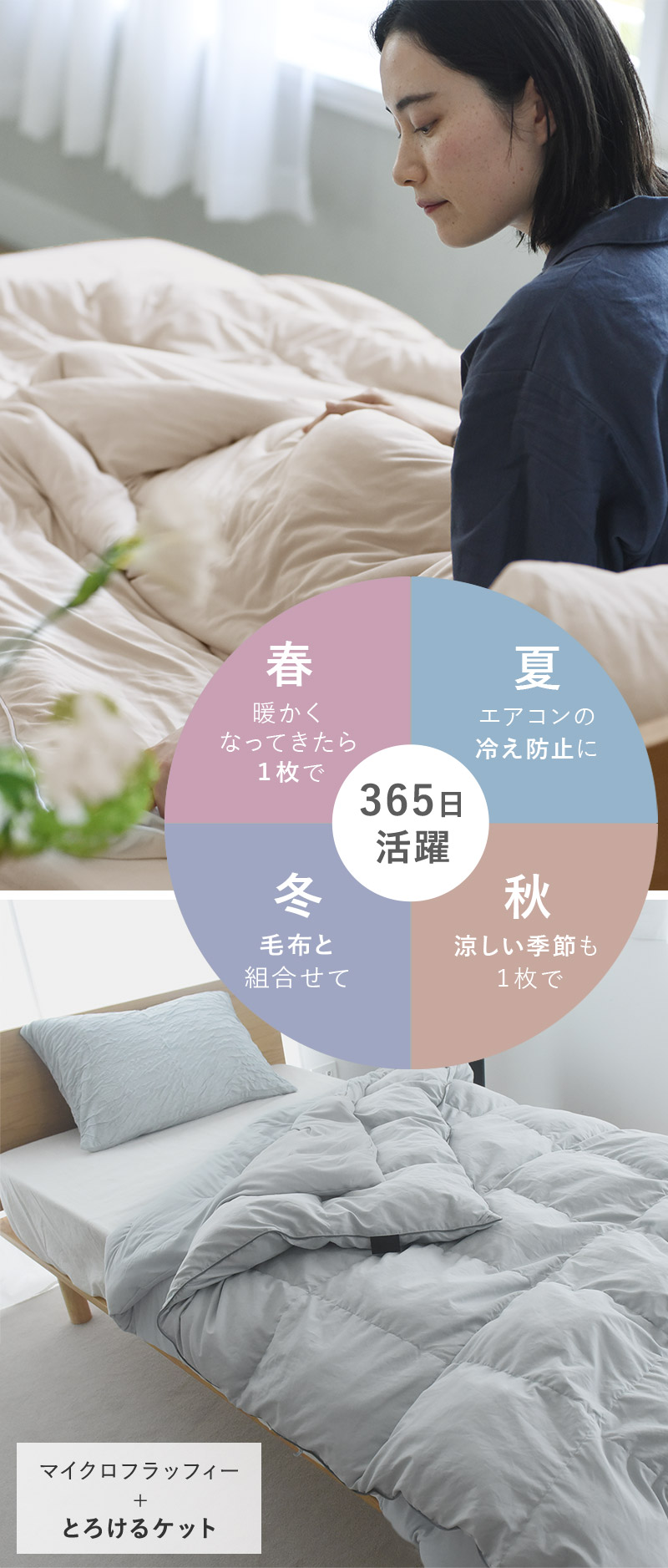 春・秋は1枚で、クーラーを使用して就寝する夏は肌掛け布団として、冬は羽毛布団や毛布と組み合わせてなど、一年中お使いいただけます。
