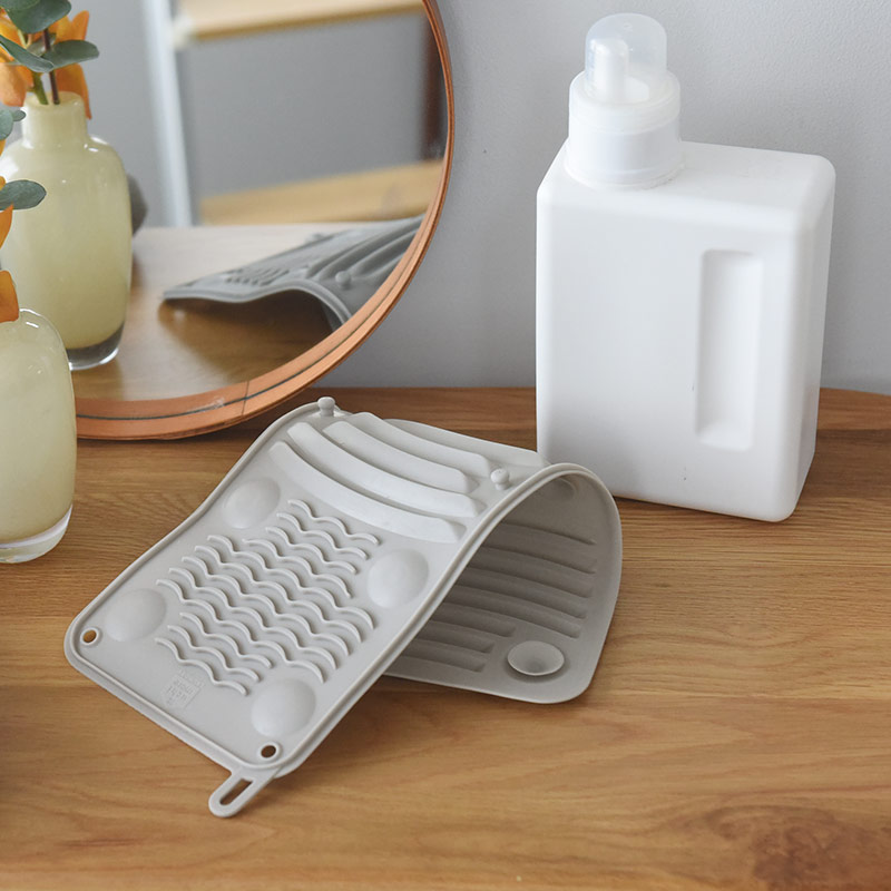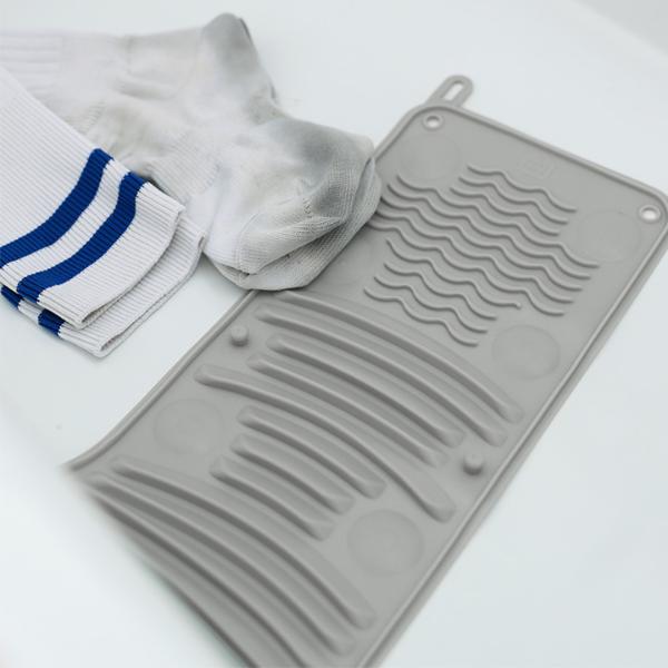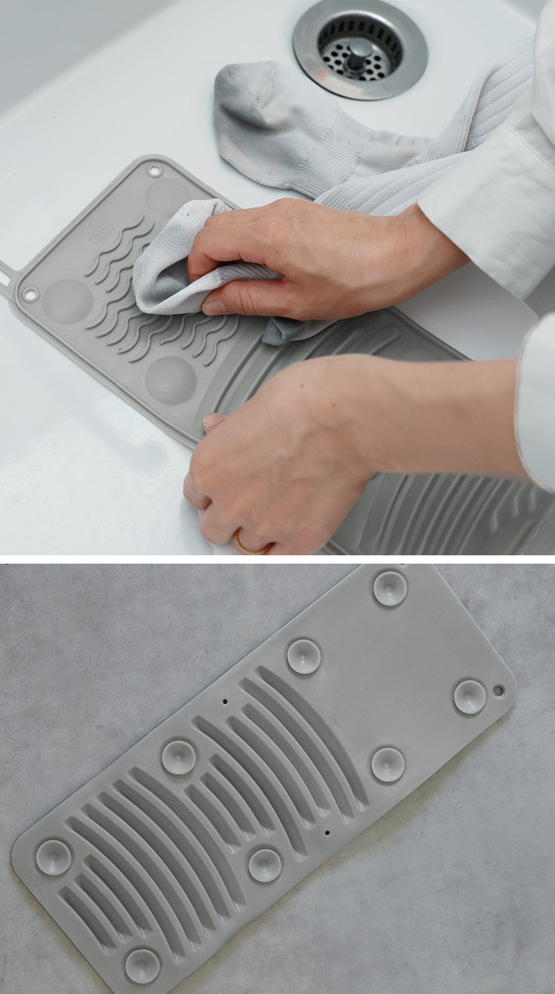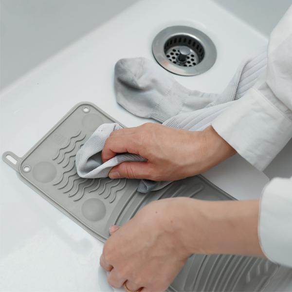 よくある木製やステンレス製、硬いプラスチック製などの洗濯板は、洗面台や洗面器でゴシゴシしているうちにズレてくるのが悩みでした。