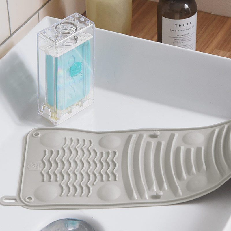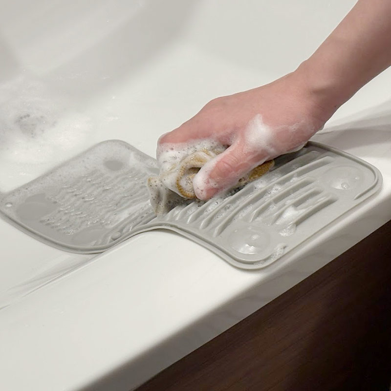 どこでも使えるソフトな素材やわらかな素材なので、さまざまな形状の洗面台や洗面ボールにもフィット。シンクのカーブに沿うことで、しっかりと貼り付けることができます。