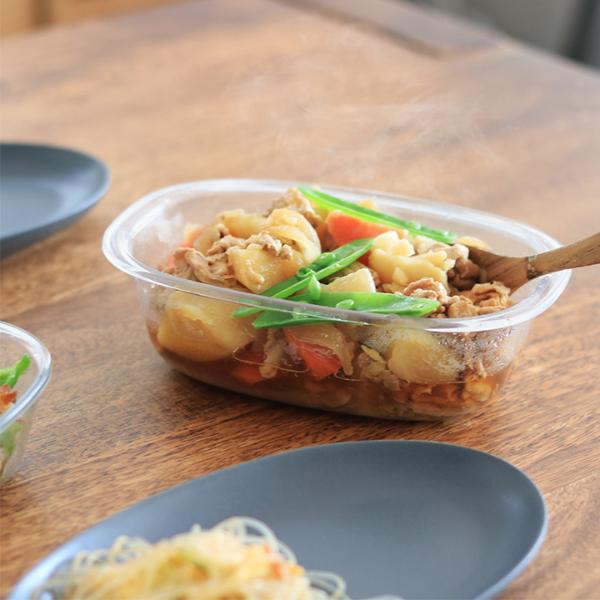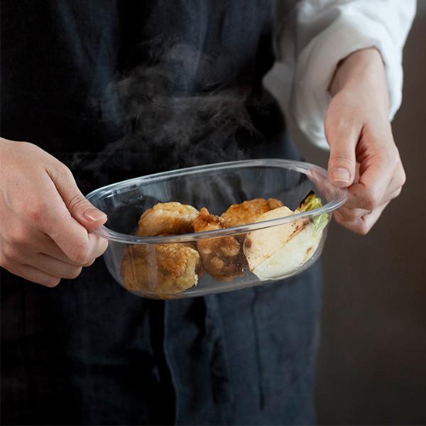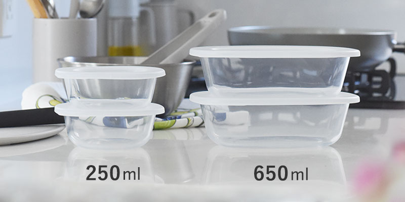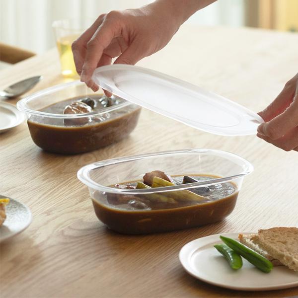 - 一見ガラスのような透明感のTPX樹脂製保存容器650mLサイズ。本体も蓋もレンチンできて、さらにそのまま食器としても映える、まさに「うつわにもなる保存容器」です。