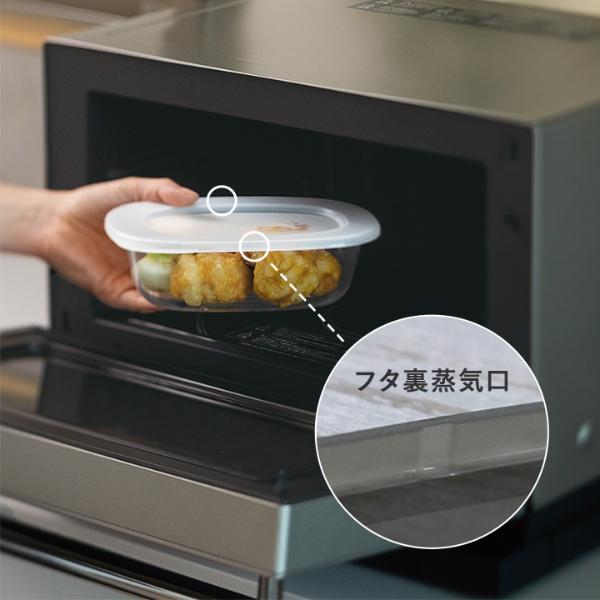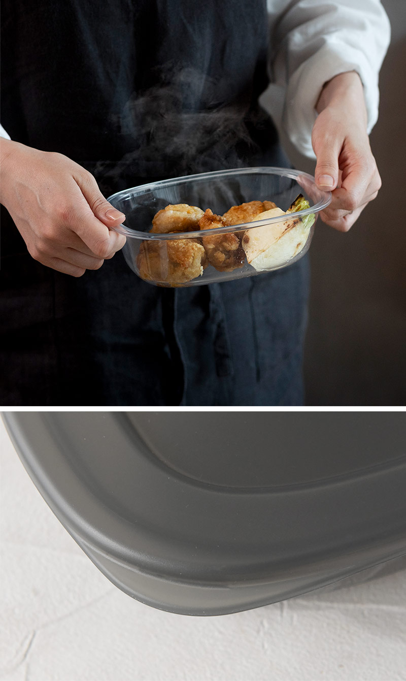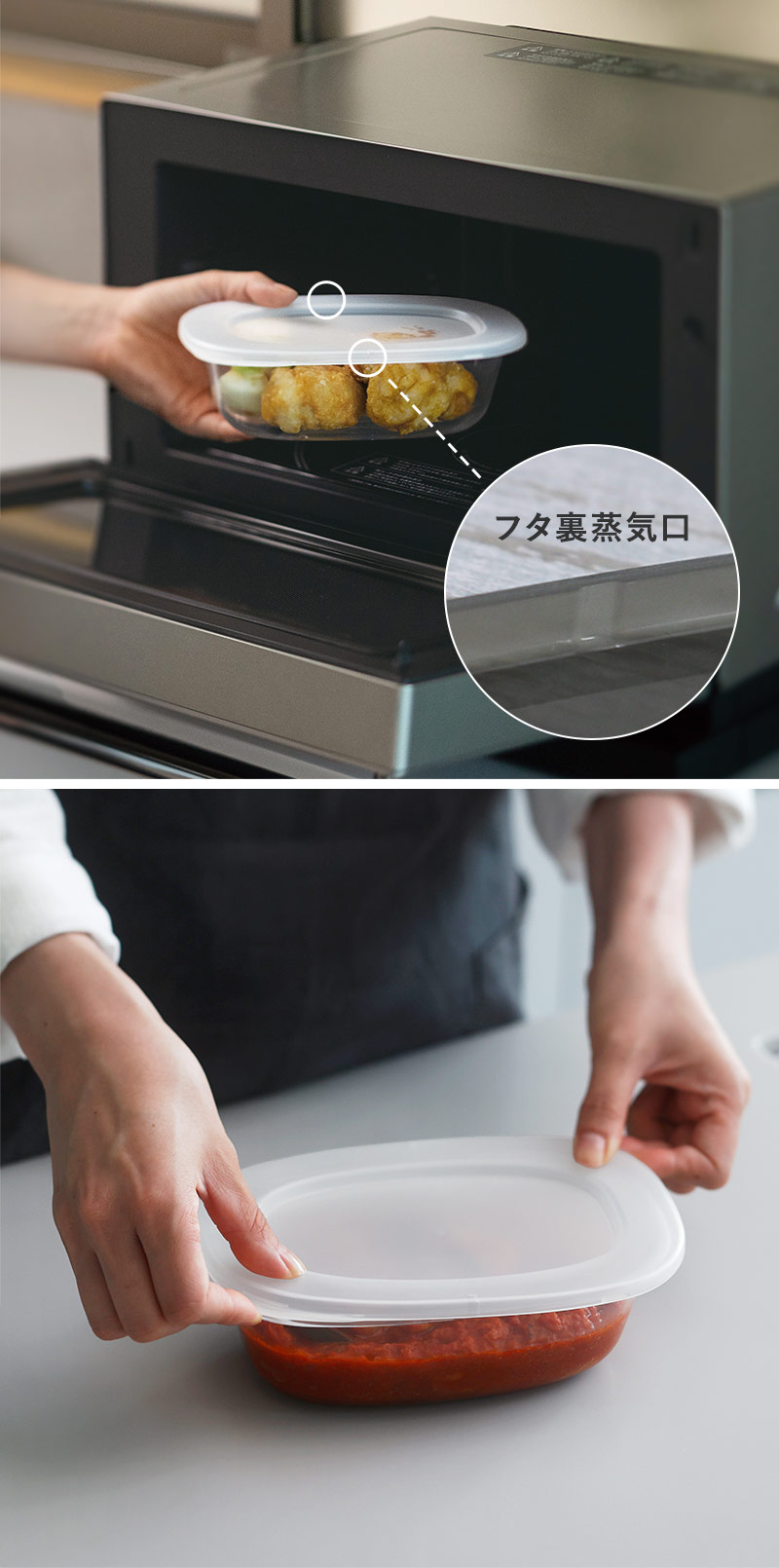 さらにフタにも工夫があり、温めた時に小さいくぼみから蒸気が逃げる仕組みに。冷凍庫から出したものも、冷蔵庫から出したものも、どちらもフタをしたままレンジで温めることができます。
