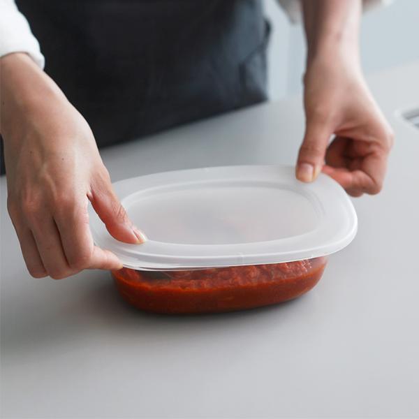 フタの中央には凹みがあり、同じ容器で重ねやすい仕様に。作り置きおかずの小分け保存もすっきり美しく整います。