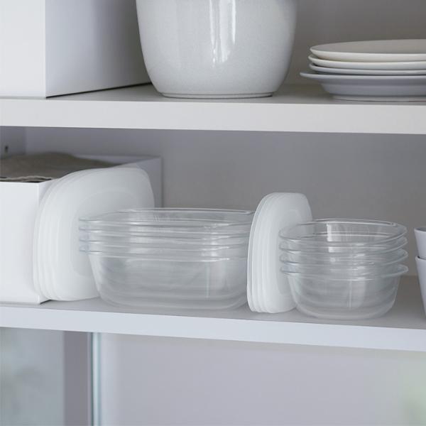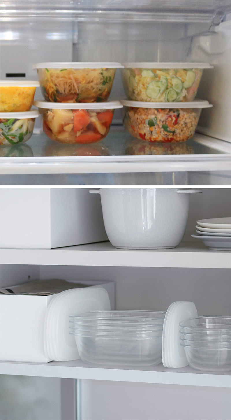 フタと容器それぞれに分けてスタッキングもできるので、食器棚でも省スペース。
