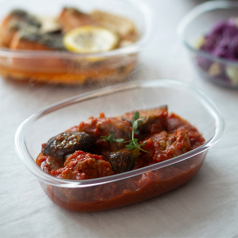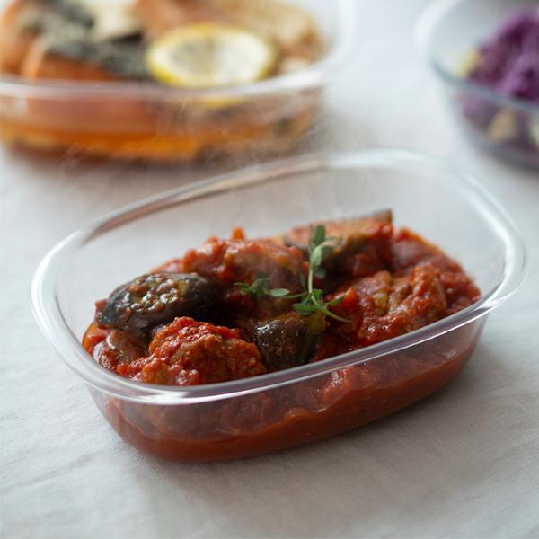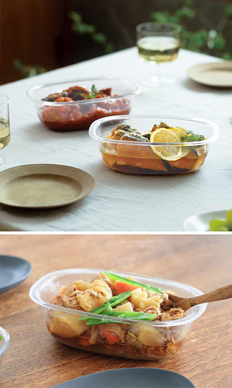 保存した作り置きおかずを、お皿に移しかえずそのままサーブしてもOK。まるでガラスのような透明感と美しいシルエットが絵になる、マーナの「うつわにもなる保存容器」。