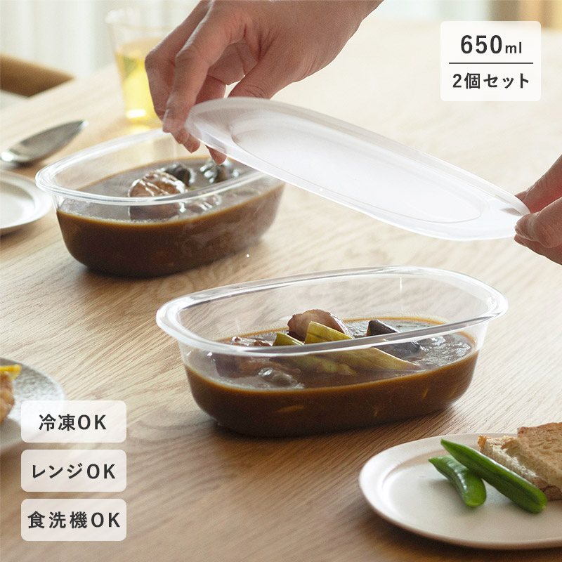 ハンバーグや煮物なども入る、ゆったりサイズの650mLサイズ。2個セットなので、休日にまとめて作り置きした時にも便利です。