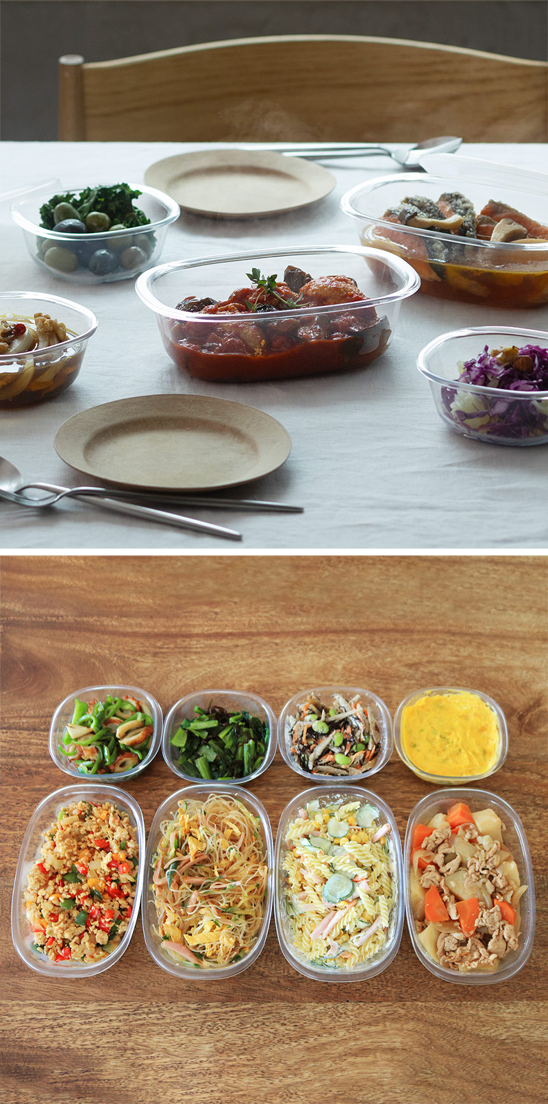 冷蔵庫に入れておいた作り置きをレンジで温め、そのままパパッと食卓に並べるだけ。忙しい日も手抜き感のない食卓が完成します。