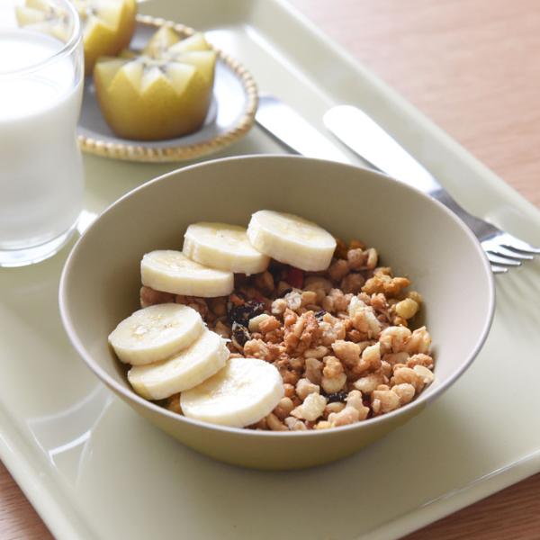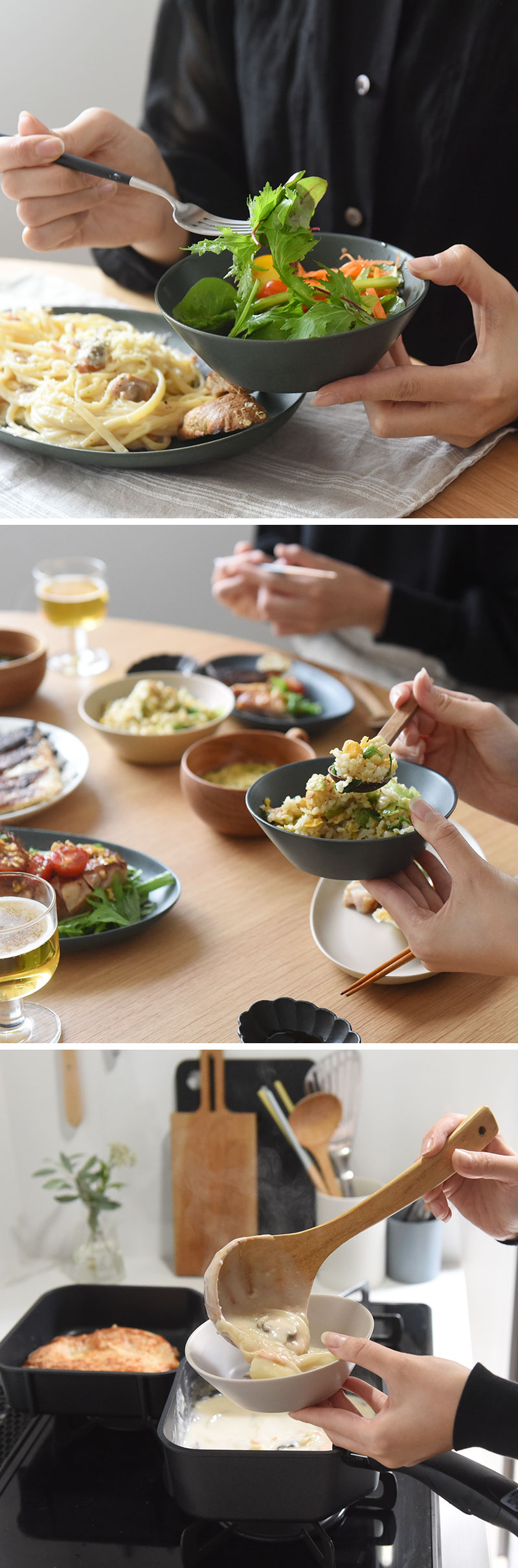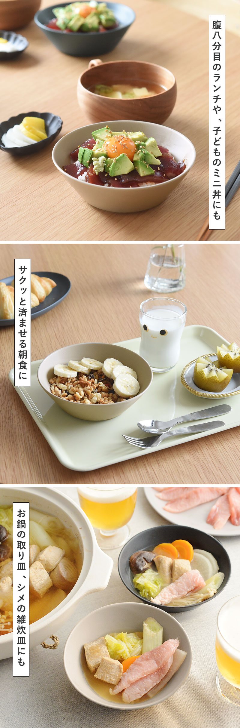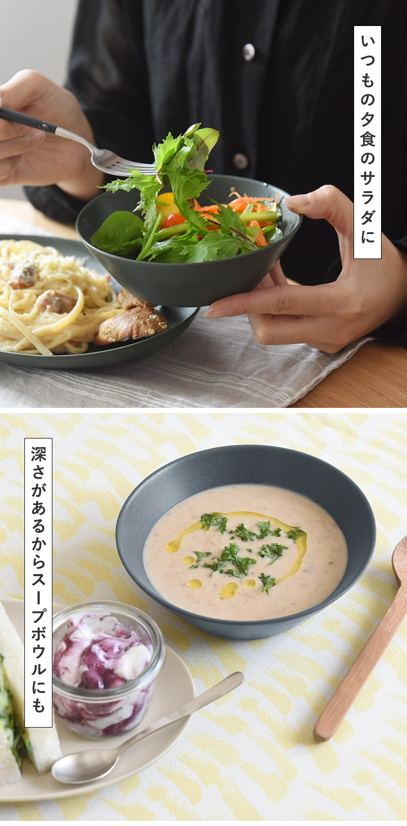 朝食はシリアルや、フルーツ&ヨーグルト。手軽に済ませる昼食の小丼、夜は野菜たっぷりのグリーンサラダや、スープの盛り付けにも。冬はお鍋の取り皿としても使える、汎用性の高いうつわです。