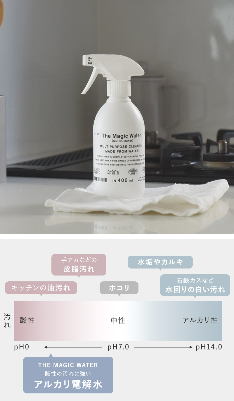 pH12.5の高アルカリ電解水が様々な油汚れを落とし、さらに高濃度だからこその除菌機能も発揮!水でできた安全安心のクリーナーは、赤ちゃんやペットグッズのお手入れにも◎。