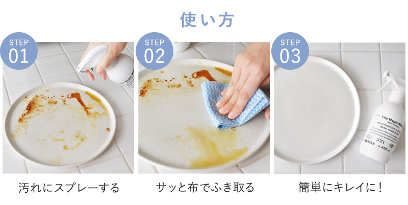 使い方は、汚れた箇所の表面が濡れる程度スプレーした後、水で洗い流すか布でふき取るだけ。電気分解により細かくなった水の分子が、高い浸透力で物質と汚れの間に入り込み、汚れの引きがしを促進。ゴシゴシと力を入れなくても簡単にガンコな油汚れを落とせます。