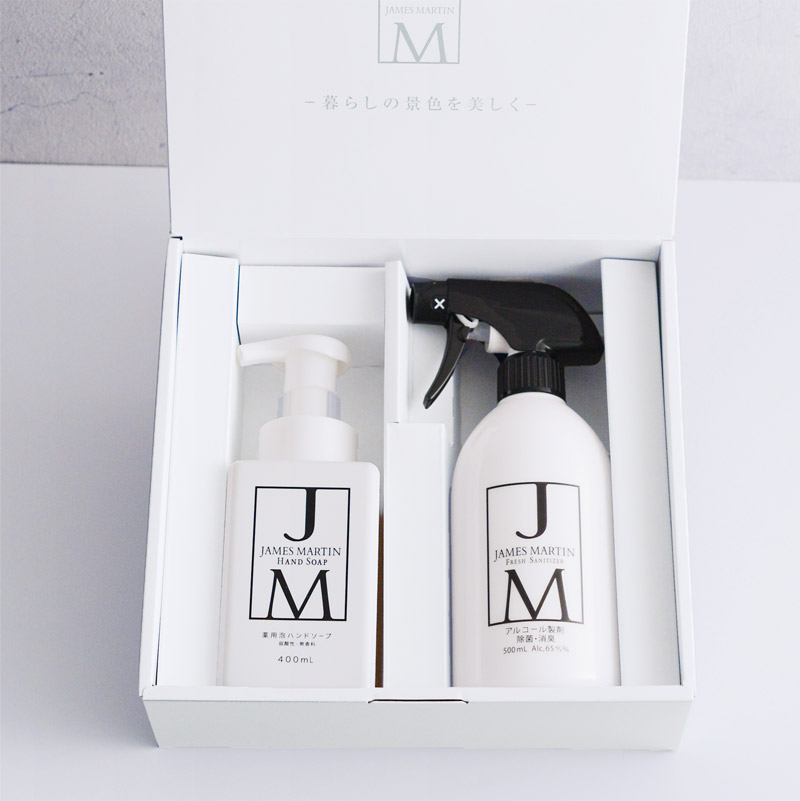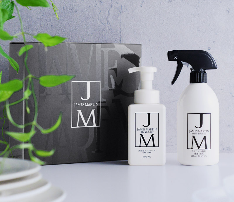 有名レストラン「ジョエル・ロブション」のキッチンでも愛用されている、JAMES MARTIN(ジェームズマーティン)シリーズ。洗練されたデザインと衛生安全を兼ね備えたハンドソープとアルコール除菌消臭スプレーが、絵になる箱入りギフトセットになりました。