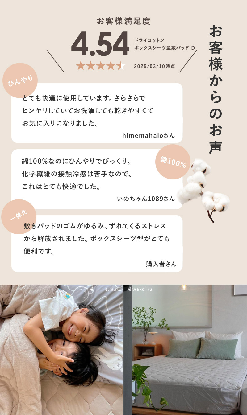 夏の夜の暑さをひんやりクールダウンしてくれる、ドライコットン100%敷きパッド。綿100%で安心の素材で、触れると冷たく感じる機能性も叶え、快適な眠りを届けてくれます。