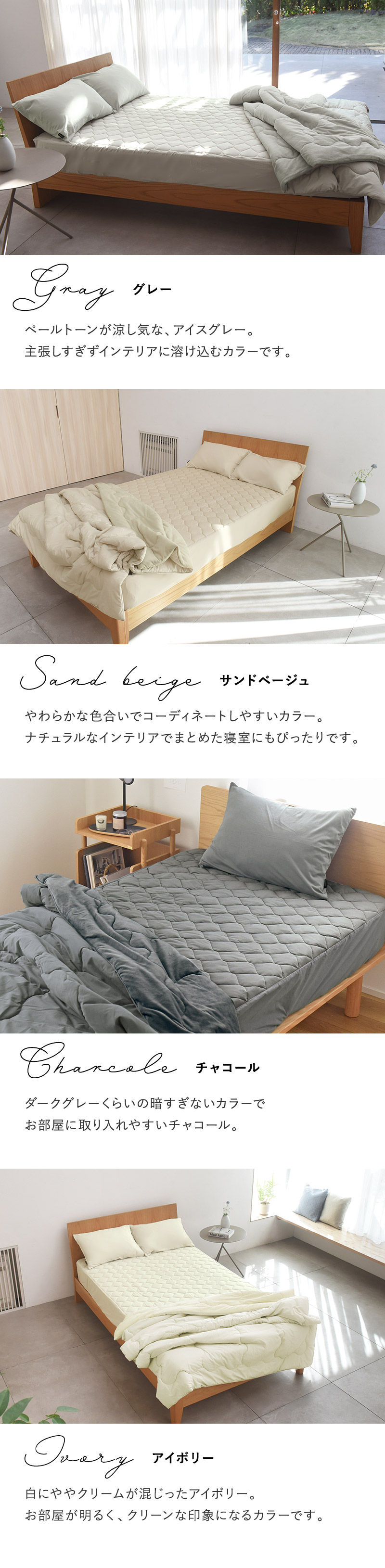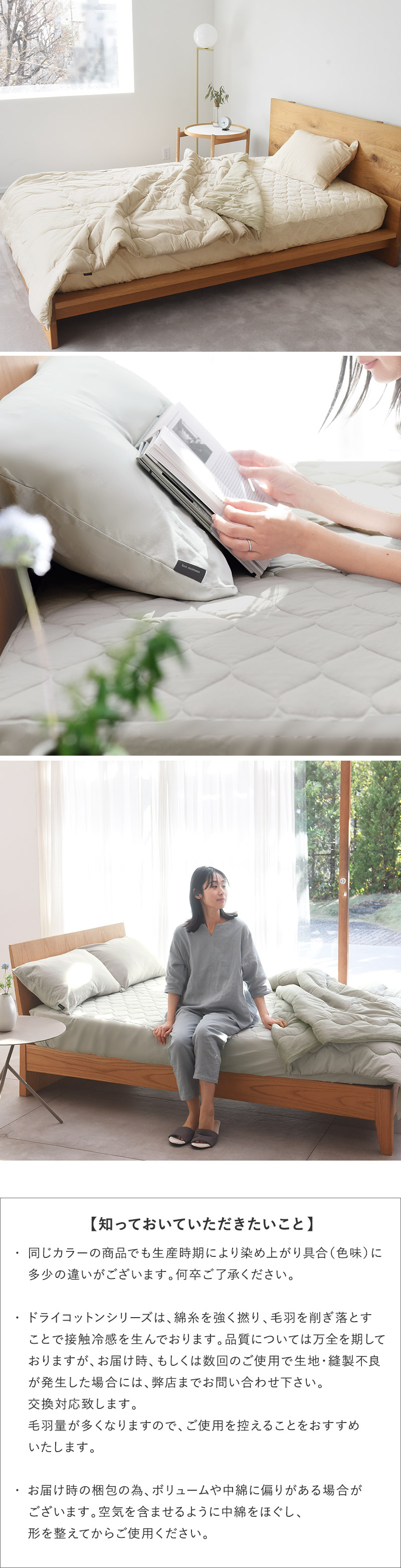 ズレにくいので、たくさん寝返りをうっても安心。側面はドライコットン素材ではありませんが綿100%素材で、ドライコットン面と色差も素材感の違いもほぼ感じられない仕上がりに。寝具コーディネートにより一体感を出すことができます。