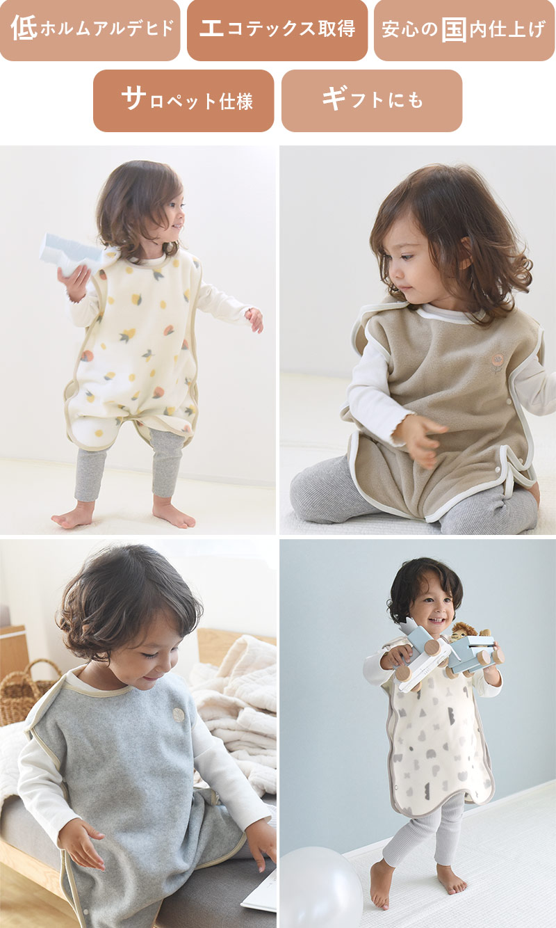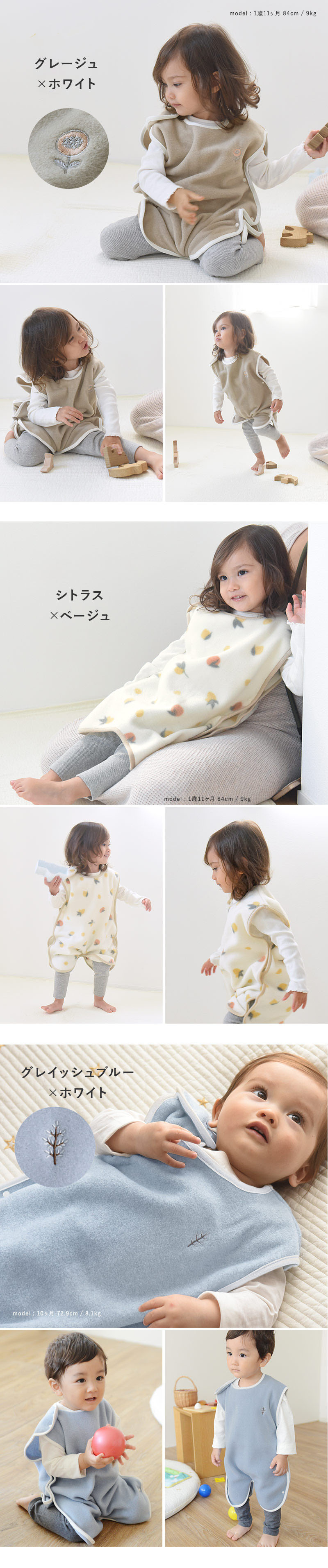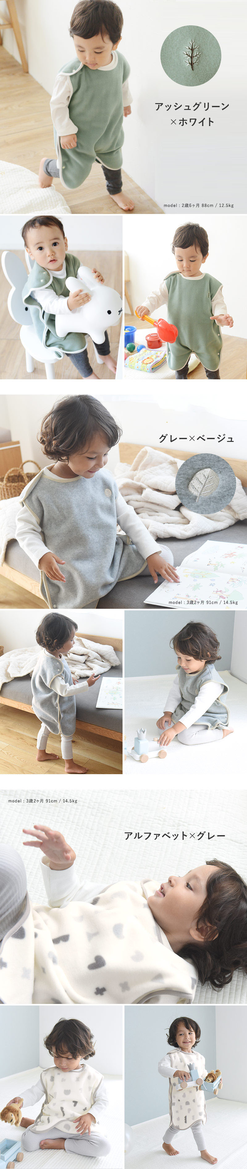 ワンサイズで、新生児~身長80cmくらい(2歳半くらい)までが対象の横開きタイプは、出産祝いにもぴったり。着るタイプなので、毛布のように蹴飛ばしたり、はだける心配もなし。ベビーの身体を朝まであたたかく包み込んでくれるから、ママもきっと安心して眠れる、冬のとっておきアイテムです。