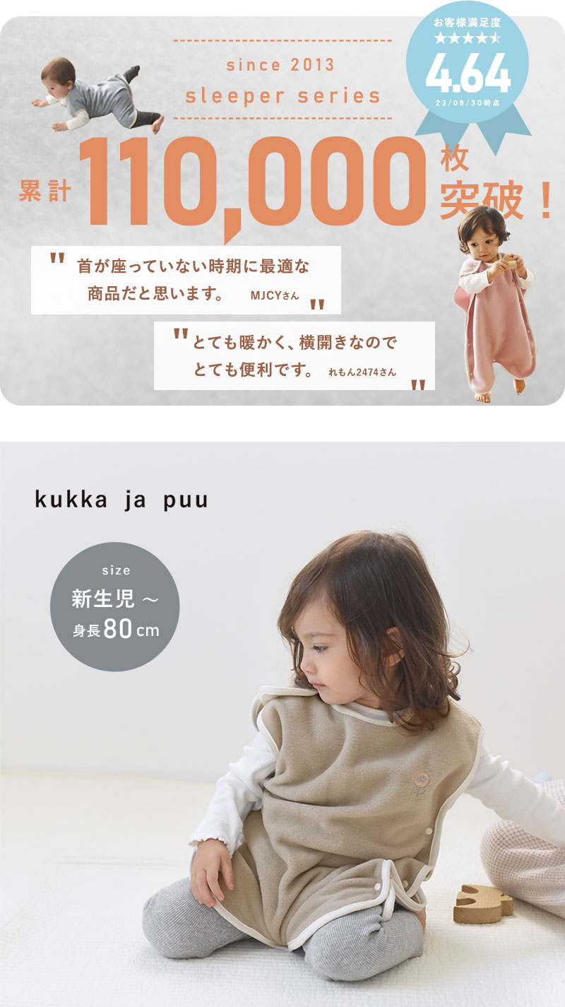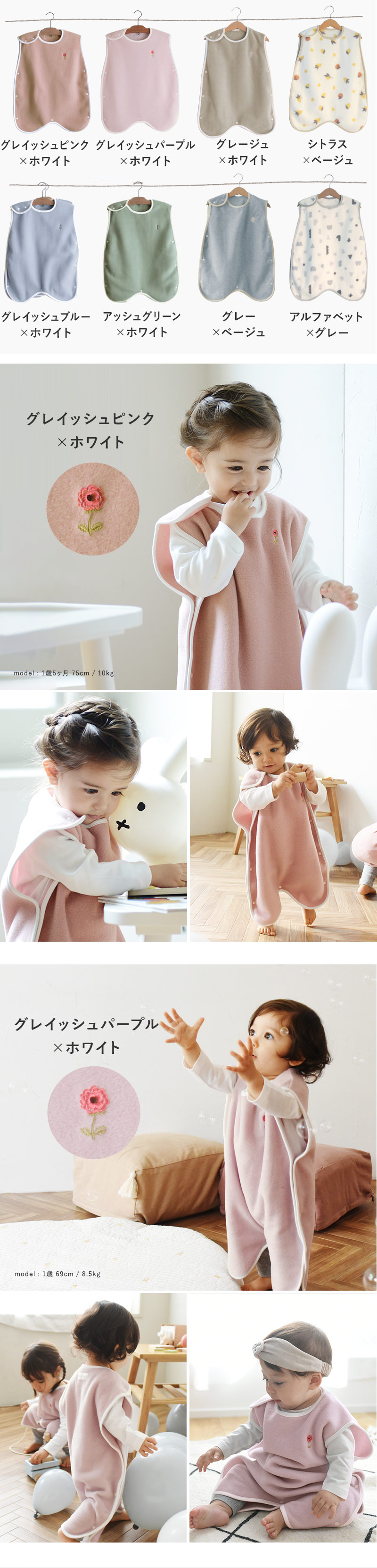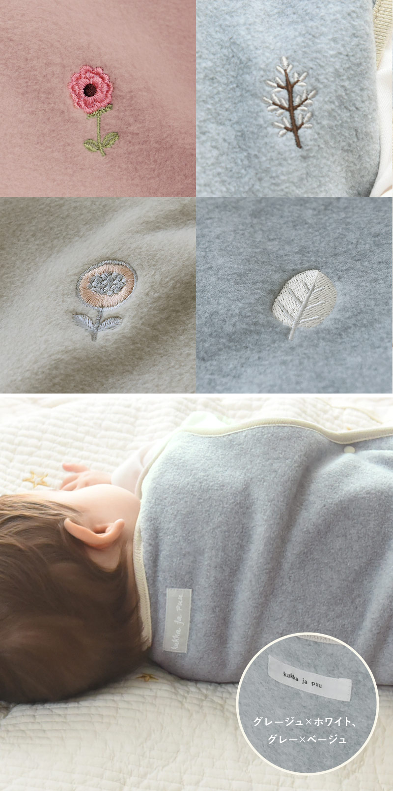 ワンサイズで、新生児~身長80cmくらい(2歳半くらい)までが対象の横開きタイプは、出産祝いにもぴったり。着るタイプなので、毛布のように蹴飛ばしたり、はだける心配もなし。ベビーの身体を朝まであたたかく包み込んでくれるから、ママもきっと安心して眠れる、冬のとっておきアイテムです。