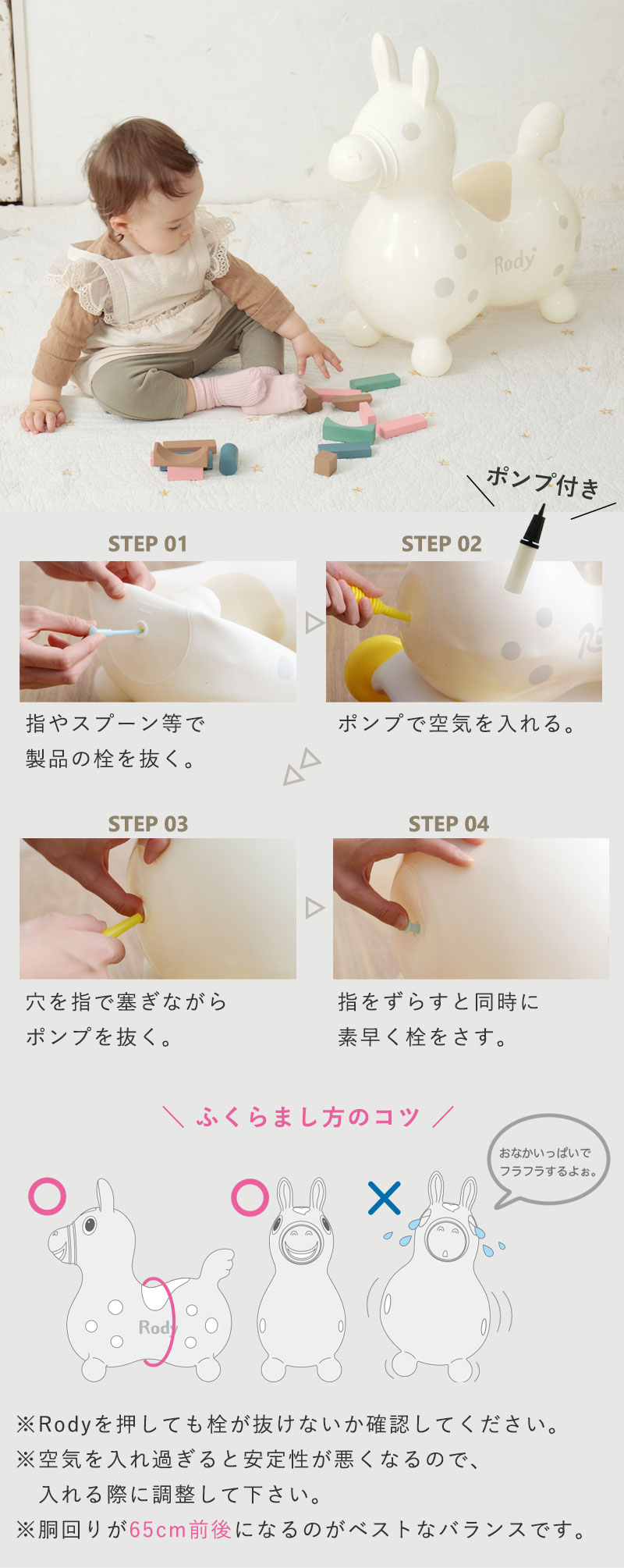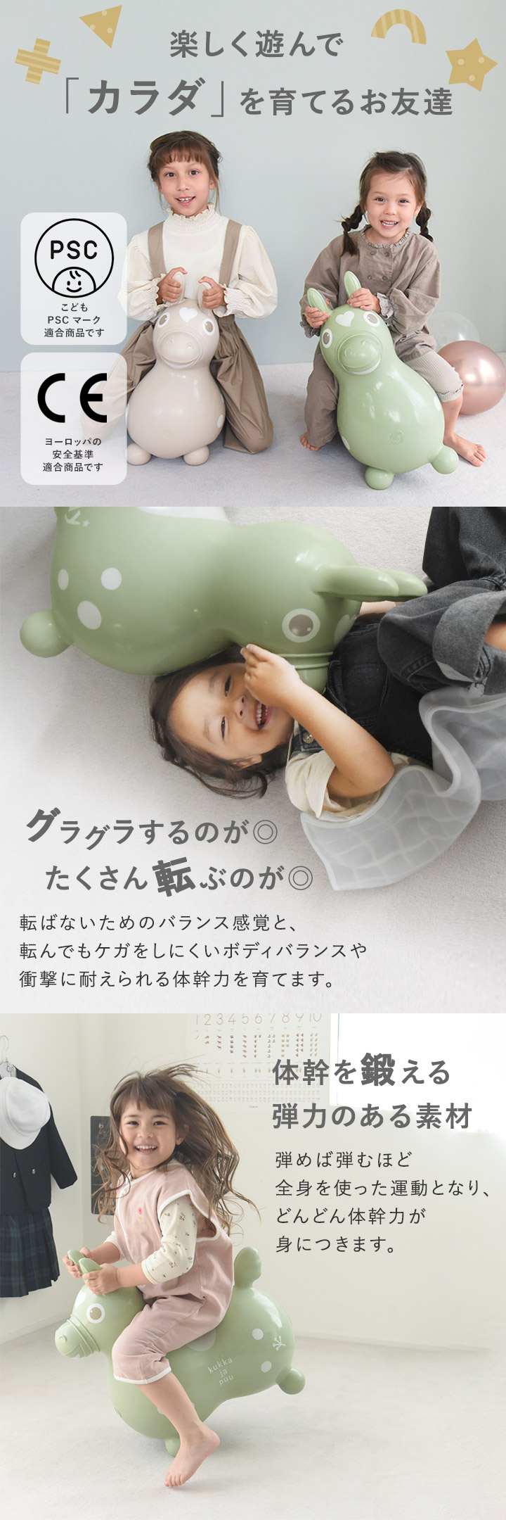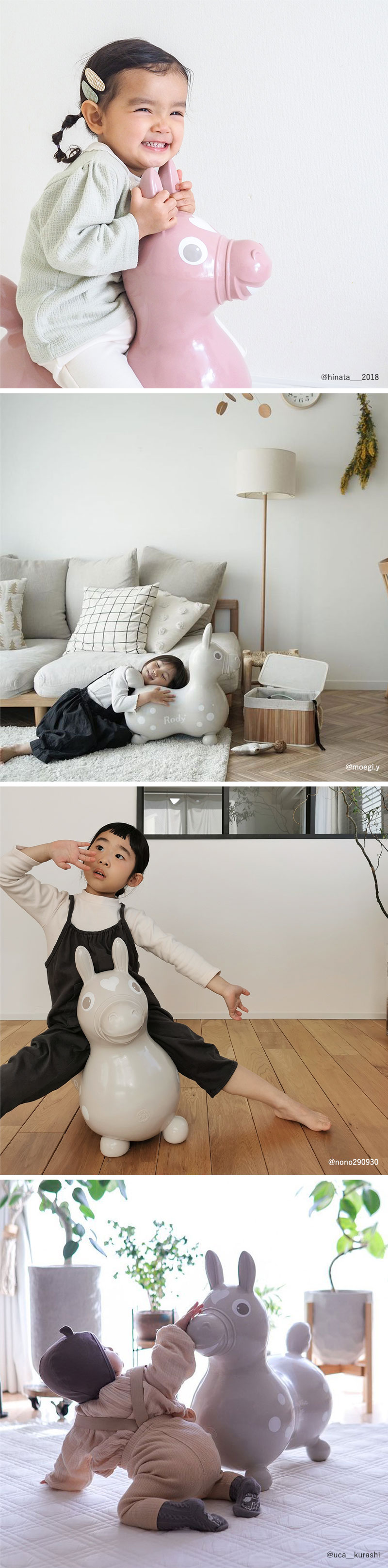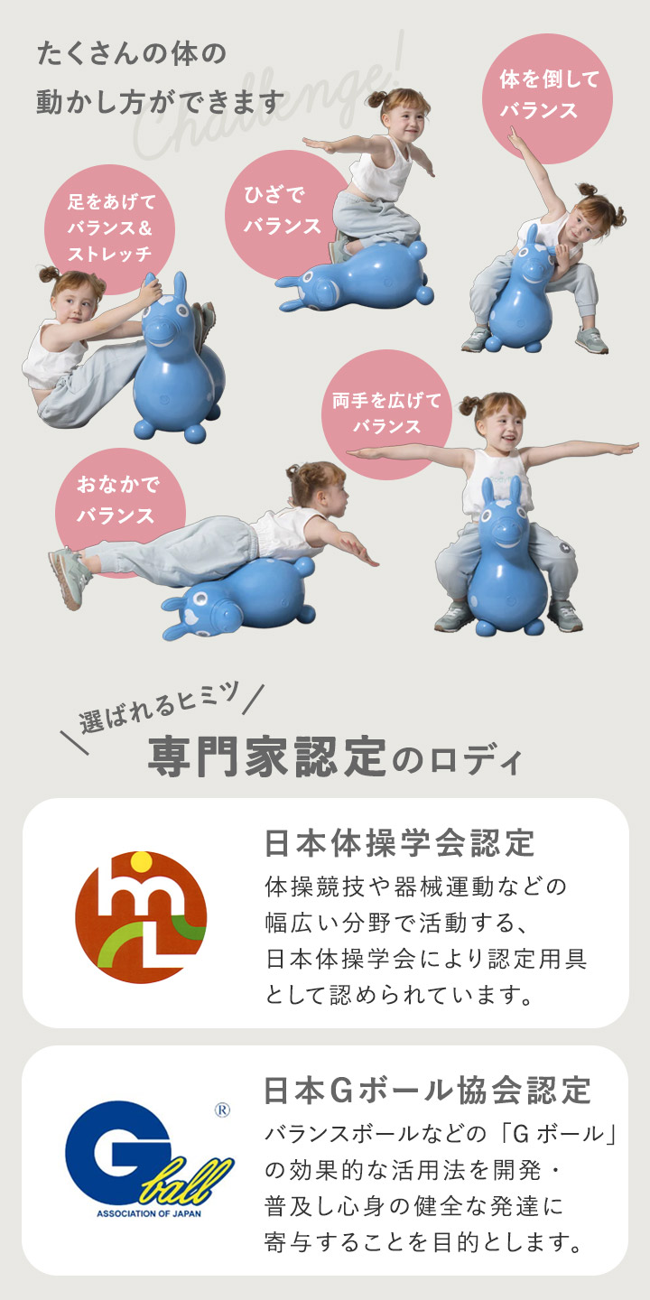 「乗る」「弾む」「跳ねる」と楽しく遊んでいるうちに、自然と運動能力やバランス感覚、体幹を鍛えてくれているのが他の乗用玩具にはないRodyの魅力。