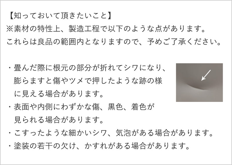 ※素材の特性上、製造工程で以下のような点があります。これらは良品の範囲内となりますので、予めご了承ください。