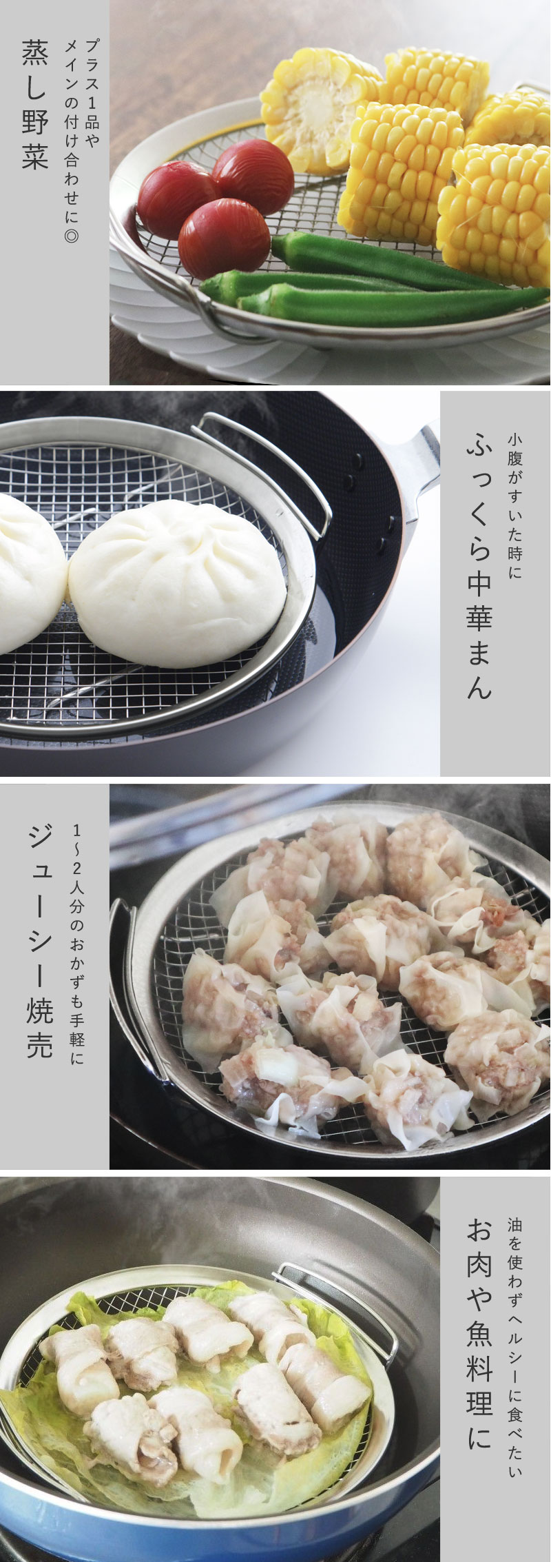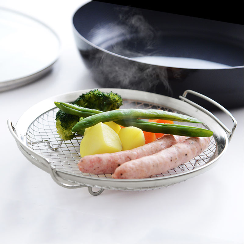 フラットな部分が多い蒸しかごは、食材の間にスチームが通る隙間を作りながら、まんべんなく並べることができ、食材に均一に火を通せます。食材の水分が奪われる事も、旨味も逃がす事もなく、瑞々しく調理が可能。
