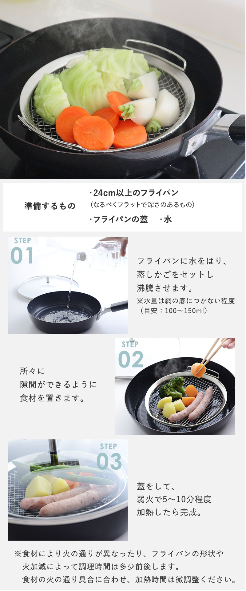 折りたたみ蒸し器だと、「食材が真ん中に寄って均一に置けない」「大きな食材は火の通りにムラがでてしまう」