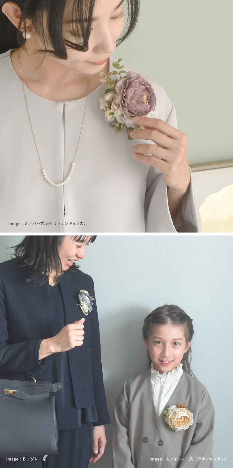 アレンジ01:お子様の胸元にもお子様のワンピースやジャケットにも◎。卒園式や入学式だけではなく、七五三やピアノの発表会でも彩りを添えてくれます。親子お揃いでつければ、お子様もきっと大喜び。