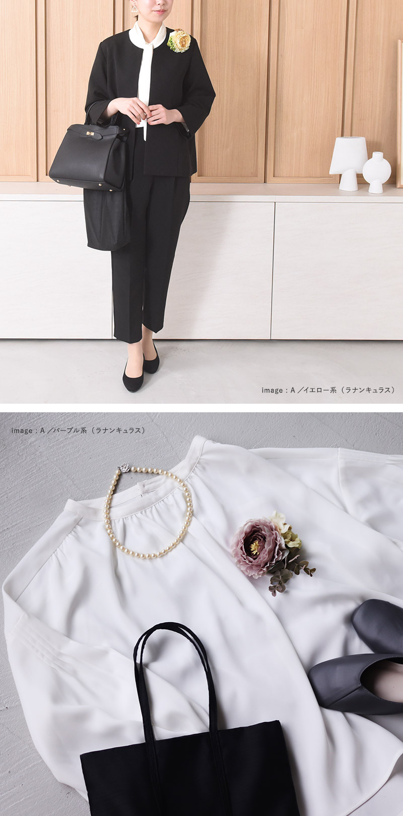 Bタイプ(2種類)Aタイプに比べ、ややこぶりなサイズ感。質感の異なる生地が調和したデザインに品の良さを感じます。シックな装いでまとめたい方や、落ち着いた印象がお好みの方に◎。