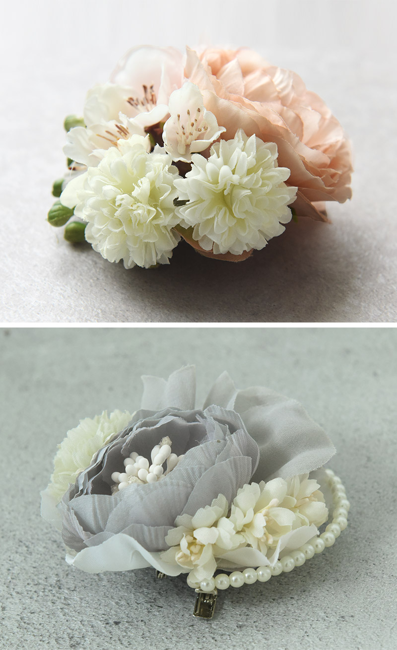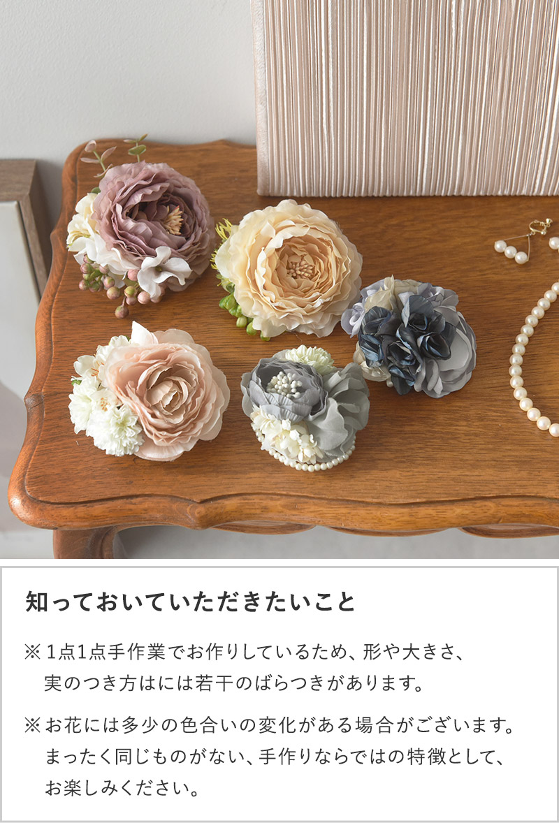 表情の異なる5種類のコサージュは、シーンやお好みに合わせてお選びいただけます。