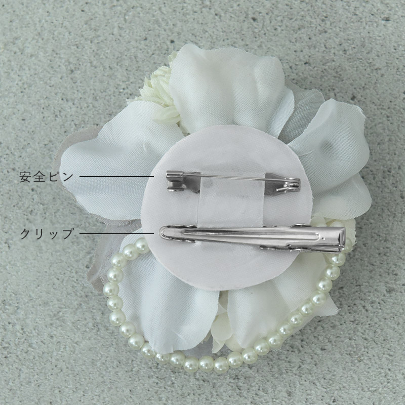 コサージュの裏側には、安全ピンとクリップがついています。お洋服に付ける際は安全ピンで留めると安定しやすいですが、穴が気になる方はクリップではさむようにして留めることもできます。