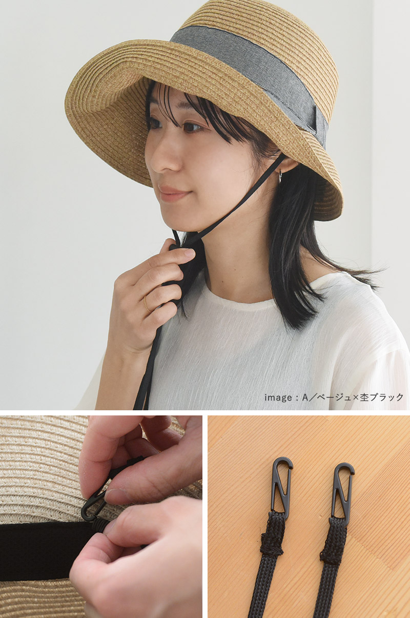 さらに今年はお客様のお声をもとに、取り外せる顎紐付きになりました。アジャスター部分はワンタッチで調整可能。自転車や風の強い日にも飛ばされにくくて安心です。