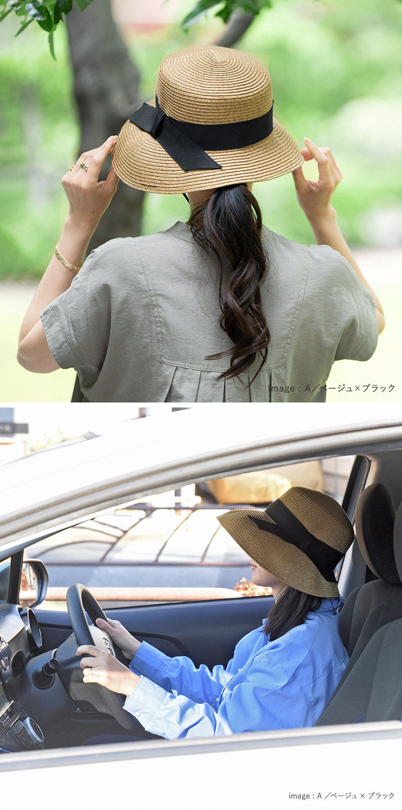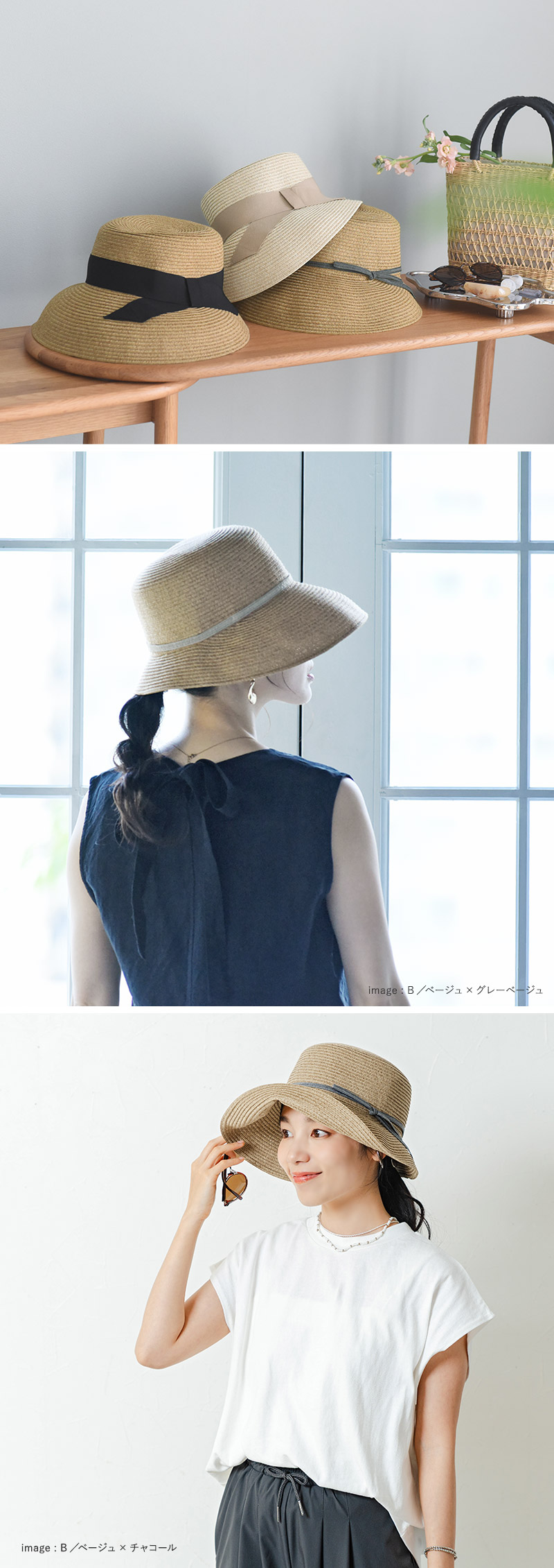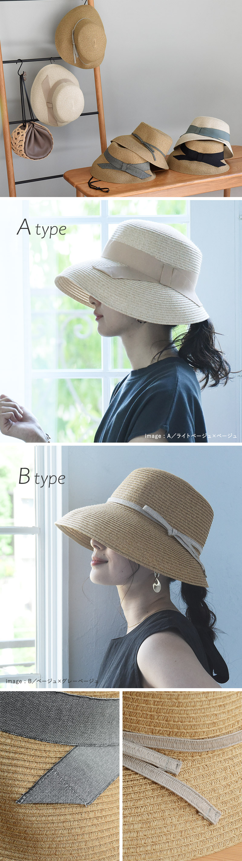 Bタイプは華奢なリボンがさりげないワンポイントに。ハットと同素材のブレードリボンを使用したカジュアルスタイルにも好相性のデザインです。