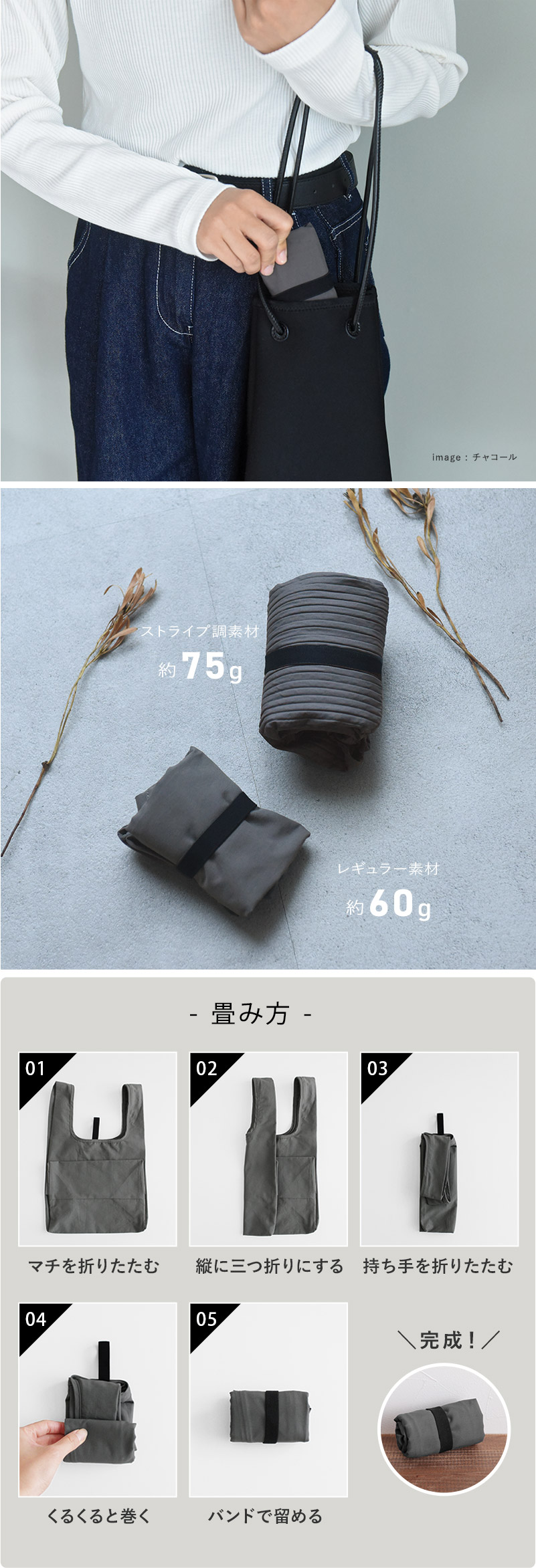 重さはわずか60g~75gと軽量。使わないときも小さく畳んでまとめておけば、バッグの中に常備しておいても邪魔になりません。