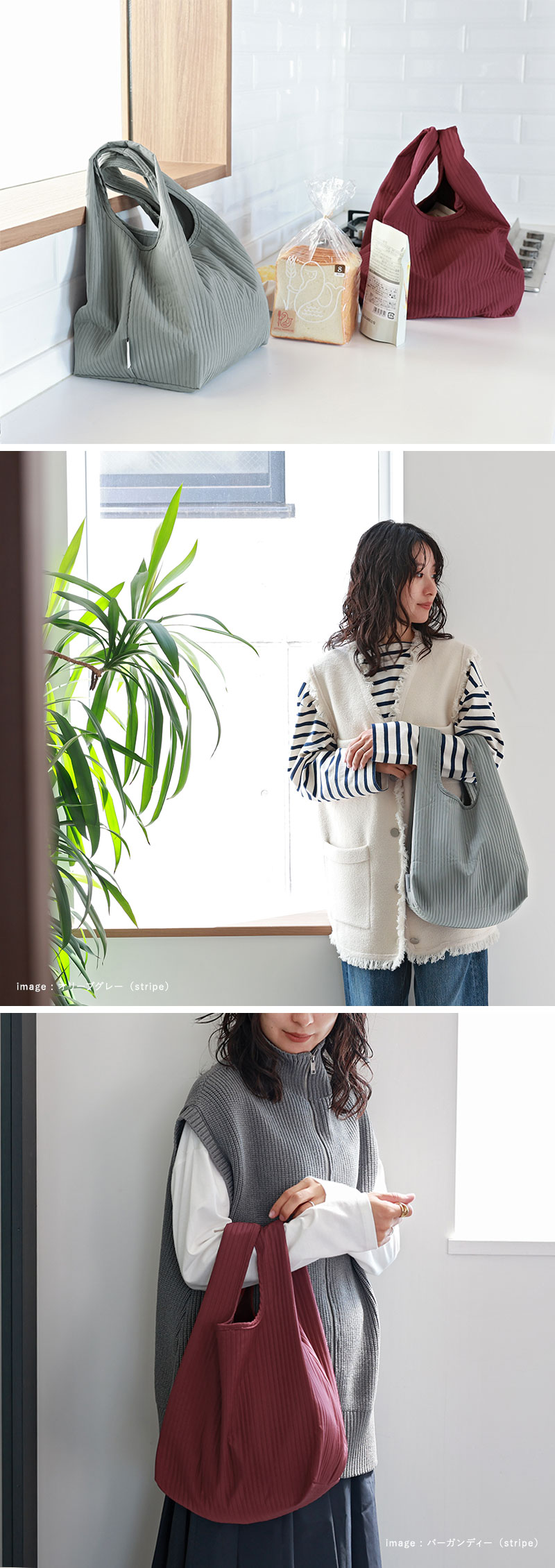 通勤や街歩きのサブバッグとしてもご好評いただいているストライプ調の素材に、秋冬新色の「オリーブグレー」と「バーガンディー」が仲間入りしました。