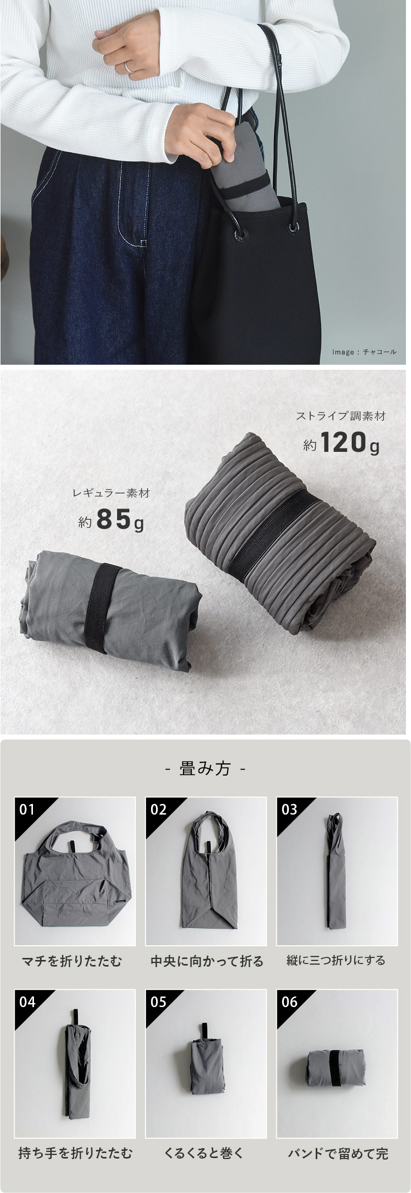 使わないときは、小さく畳んでまとめておけます。バッグの中に常備しておいても邪魔になりません。重さはわずか85g~120g程と軽いのもポイント。