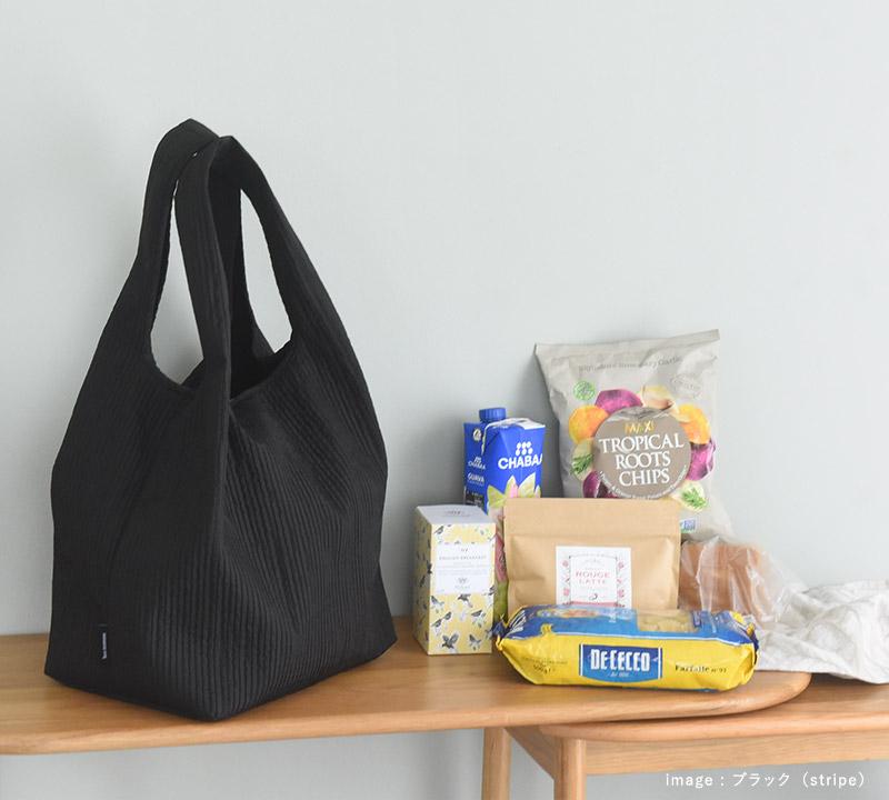 レジ袋有料化に伴い、スーパーやドラッグストア、その他のお店でも必要になったエコバッグ。bon moment(ボンモマン)のマチの大きなエコバッグMは、買い物カゴにゆったり入れた食材がちょうど入るくらいのサイズ感です。