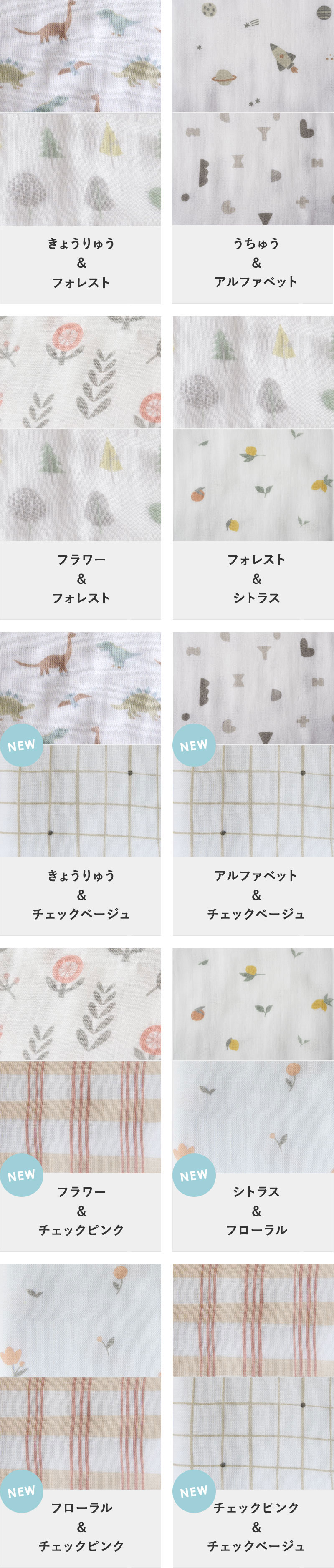 まるみのあるお花が優しい雰囲気の「フローラル」、淡いピンクとペールオレンジが温かみのある「チェックピンク」、シンプルなベージュのラインにドットがポイントの「チェックベージュ」。3柄どれも、子ども達だけでなくママの心もくすぐるような、くすみ系カラーで揃えました。