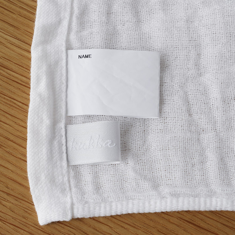 タオルの端には、kukka ja puuのブランドタグと、お名前タグ付き。幼稚園や保育園でのプール用タオルなどとして、持ち出す際にも失くす心配を軽減します。