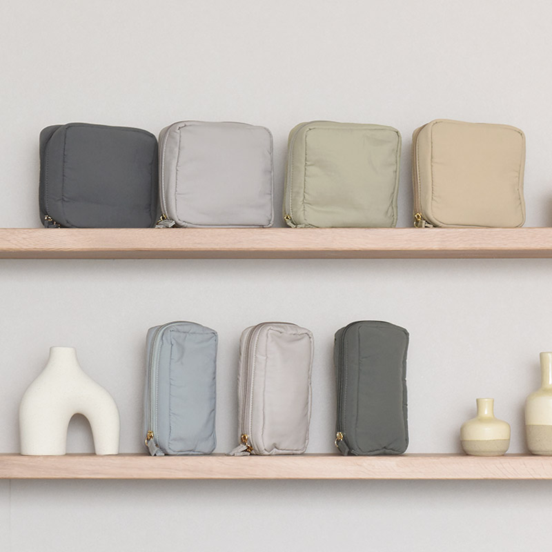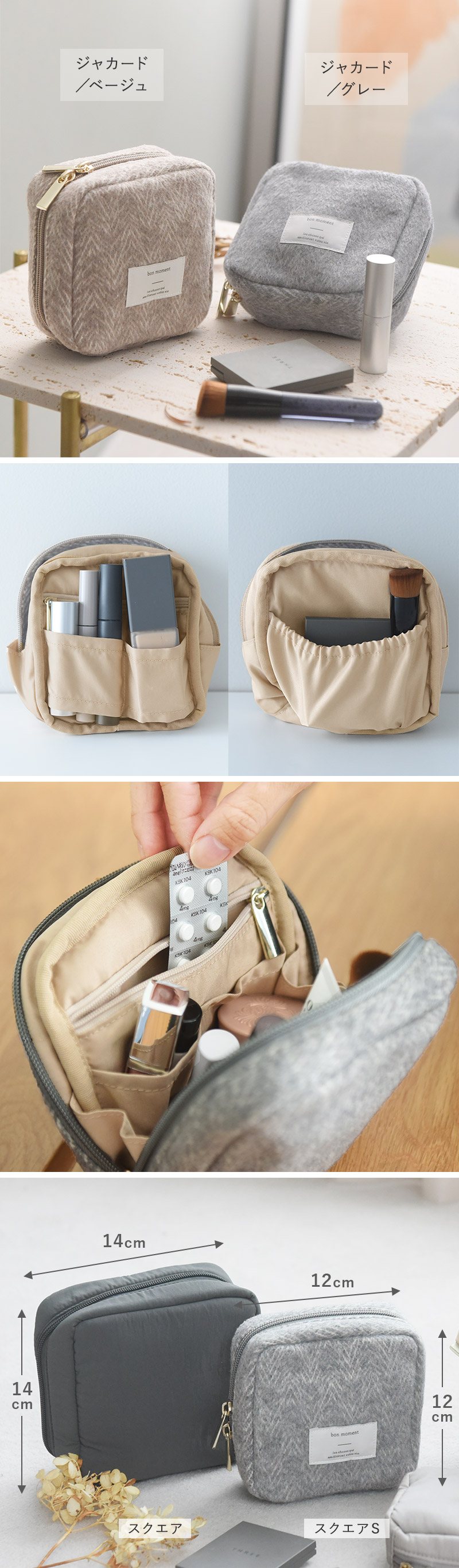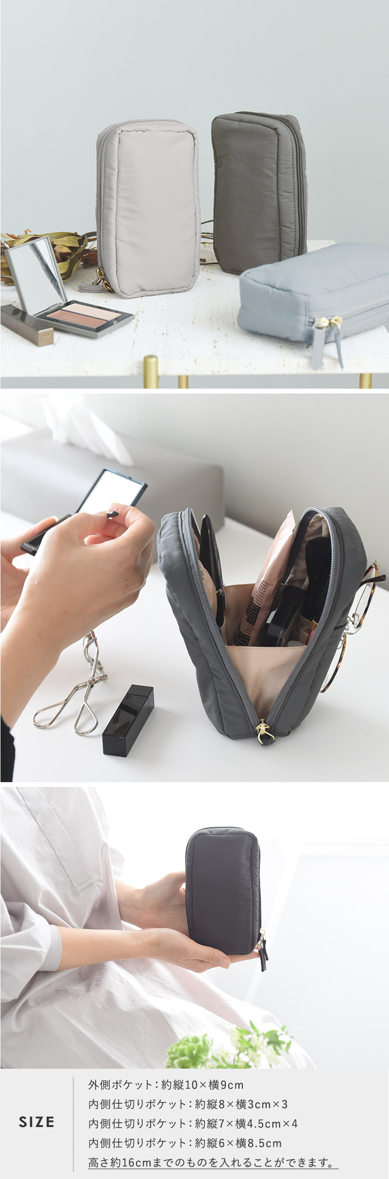 仕切りが豊富で、メイク道具の定位置が決まる、スクエア型と縦型の2型。ポーチの中が整頓されていれば、朝のメイク時間や、外出先でのメイク直しも気分が上がりそうです。