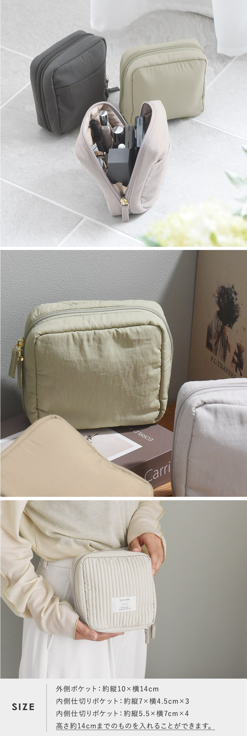 こちらは中にファスナーポケットがついており、コットンや綿棒、薬など細々しているアイテムを入れるのに便利です。ギャザーポケットには、アイシャドウやチークなど迷子になりそうなものを。ほっこり温もりのある素材が可愛らしく、化粧直しの気分を盛り上げます。