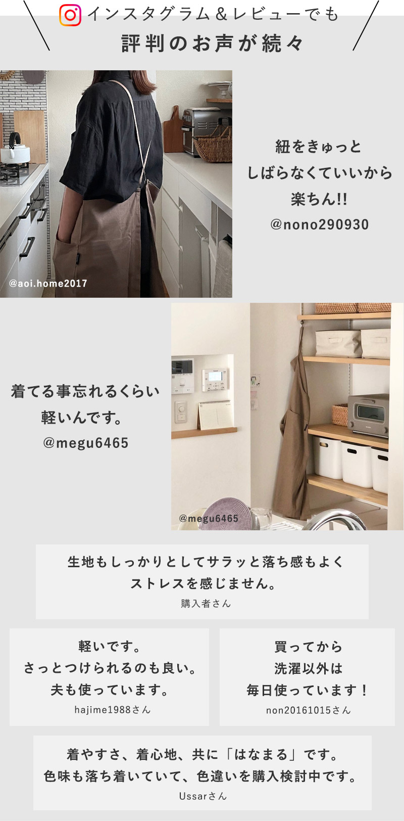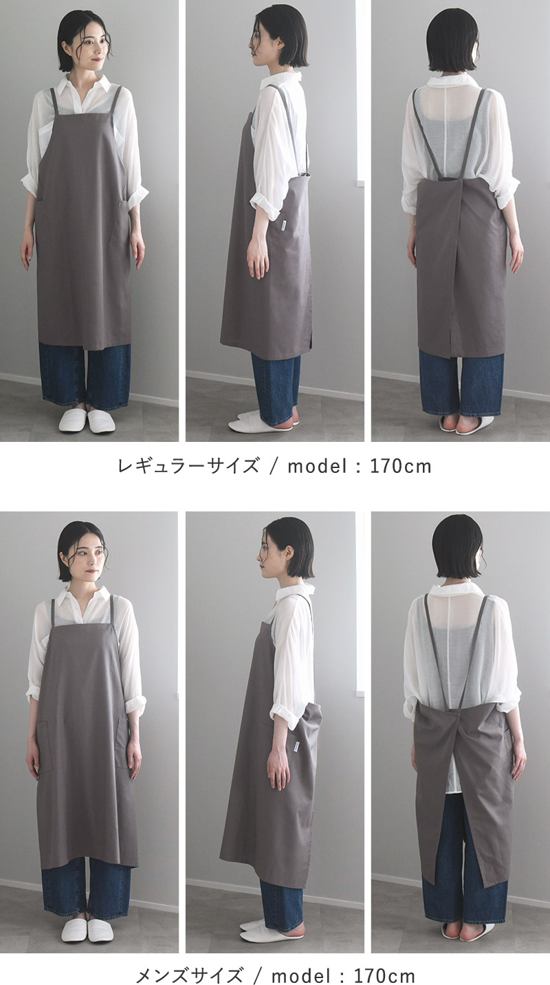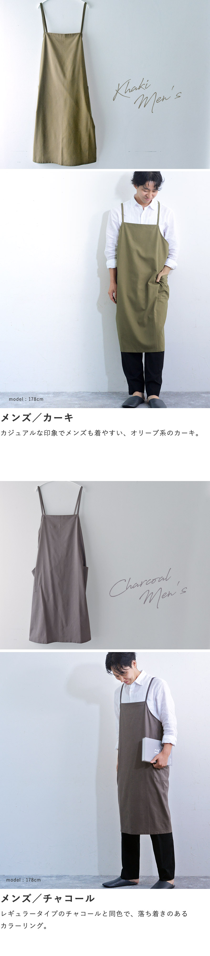 肩紐は後ろのボタンで3段階で調節でき、低身長の方でもバランス良く着こなせるのもポイント。毎日使いに丁度いいこんなエプロンを、優しい風合いの素材で作りました。