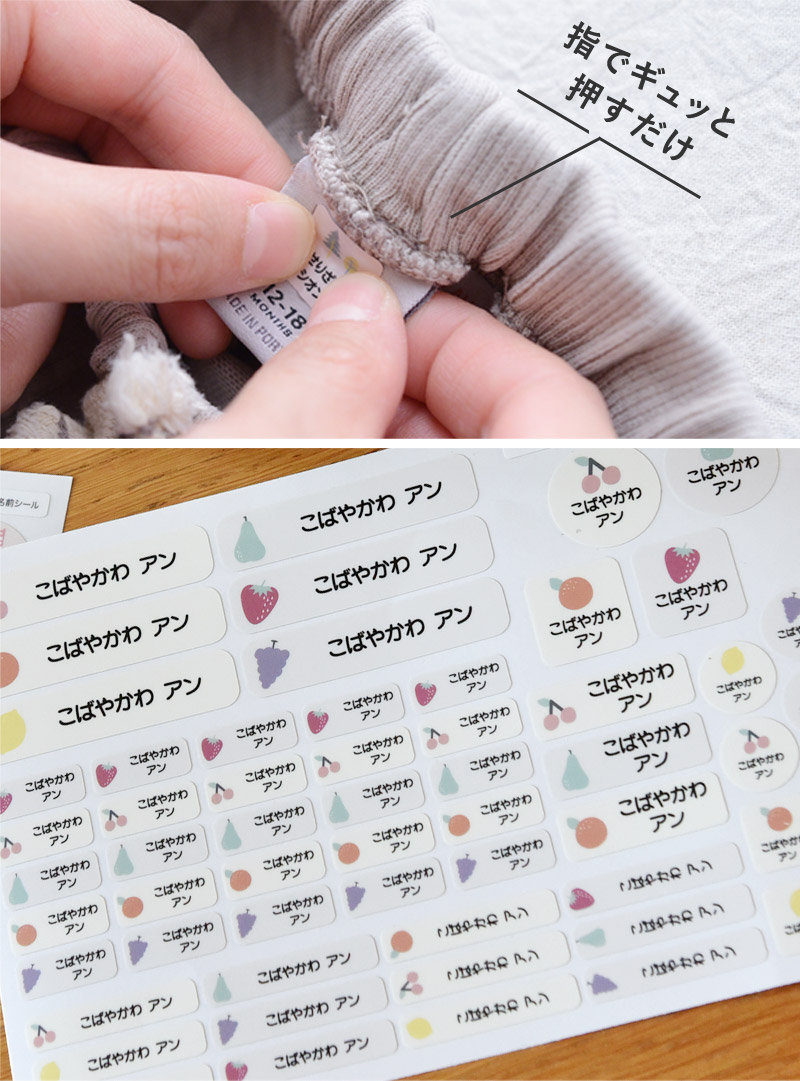 お名前付けの救世主、お名前シール(116ピース入り)。衣類やハンカチなどのタグや上履きなどに、指でギュッと押すだけでしっかり接着。アイロン不要、洗濯機・乾燥機対応です。