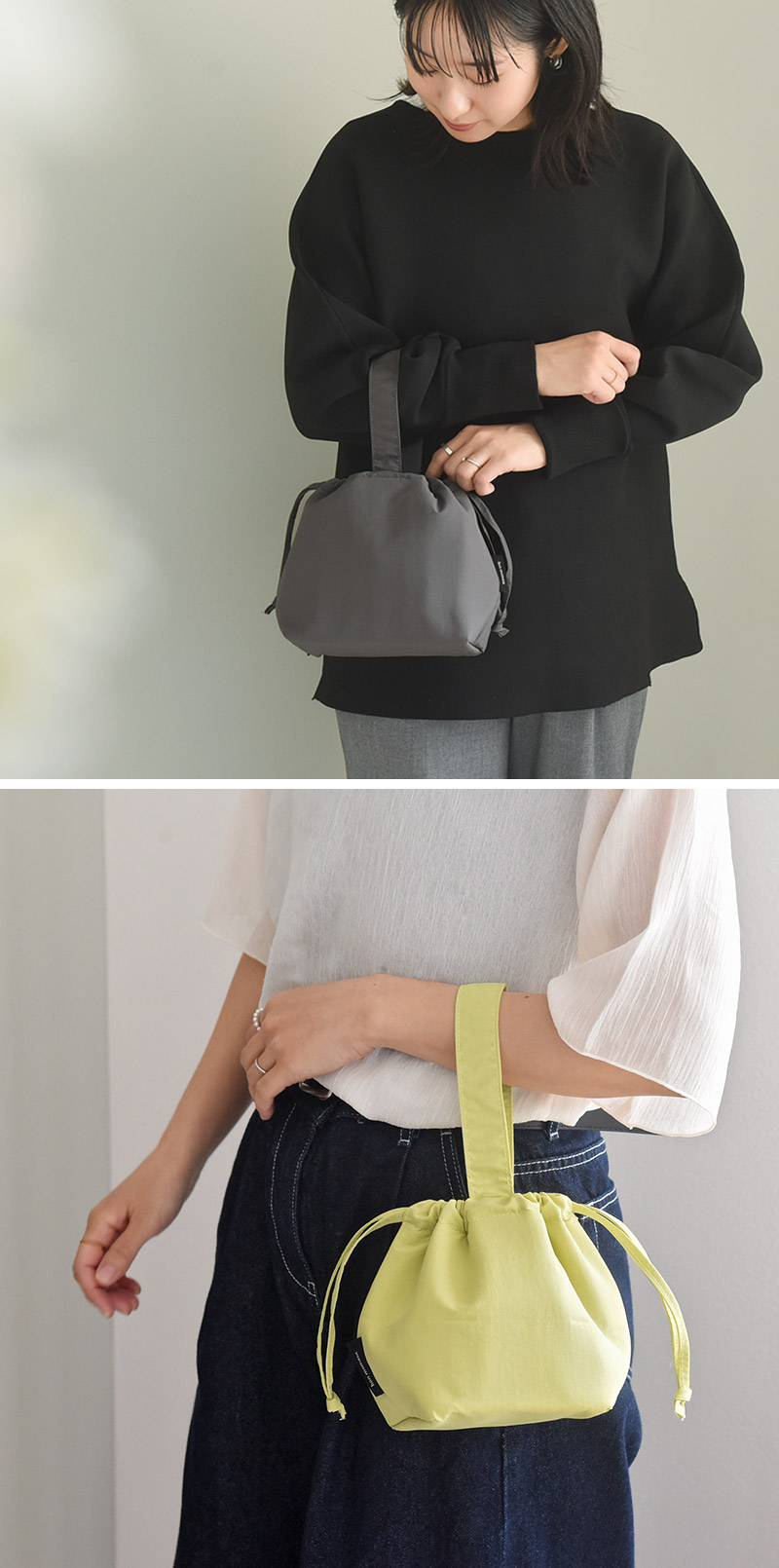 一見“ワンハンドルバッグ”のようにも見える、シンプルなルックスのランチバッグ。バッグから取り出して持ち運びしやすいように、見せ持ちできる巾着型のデザインに仕上げています。