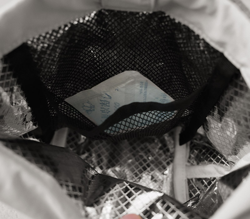 内側保冷素材の3層構造なので、保冷剤をポケットに入れておけば、ひんやりが長持ち。